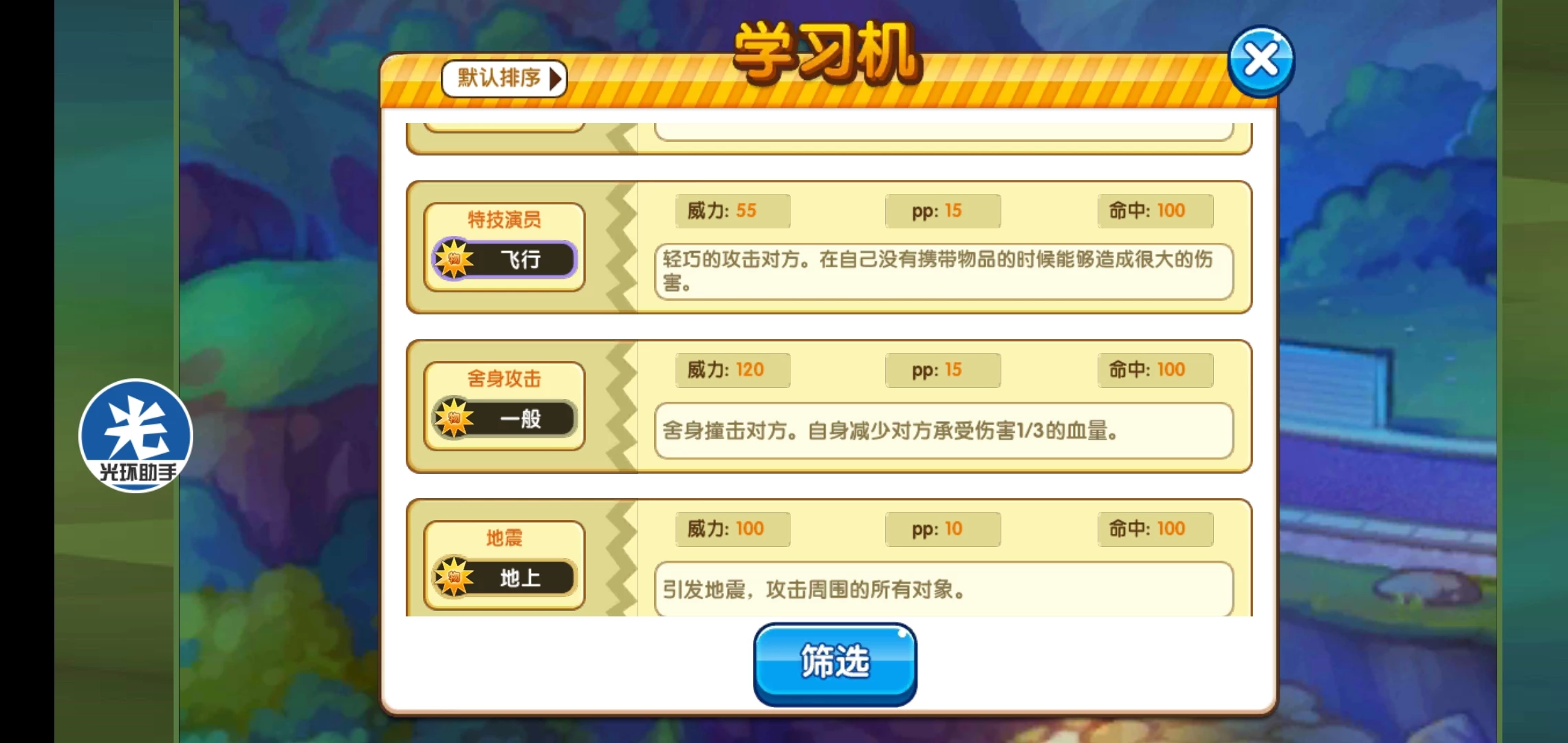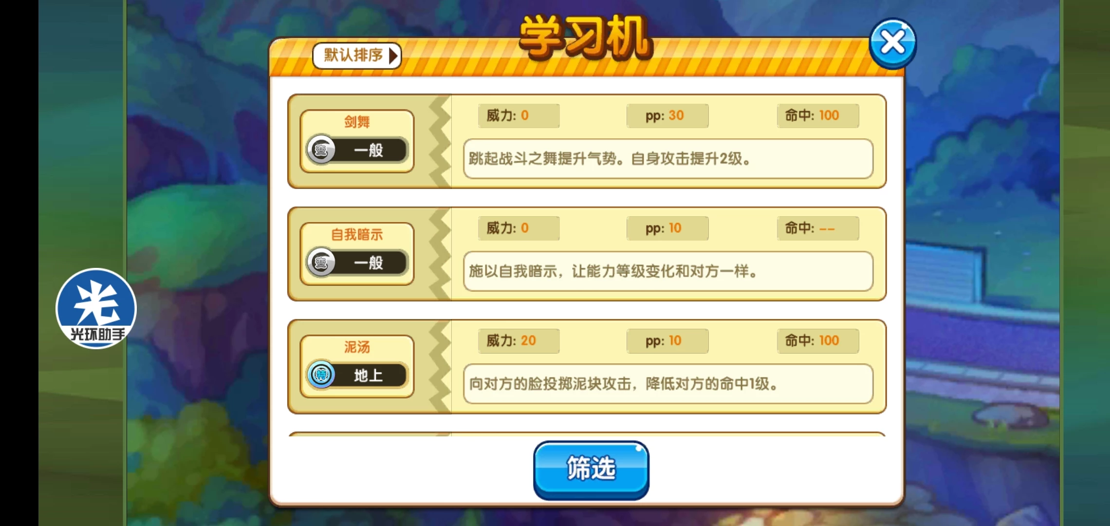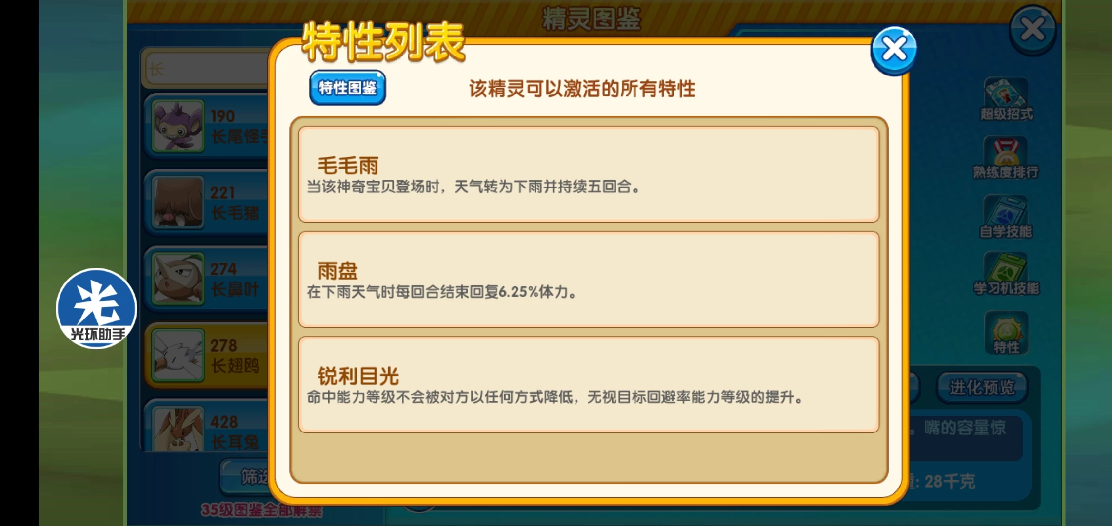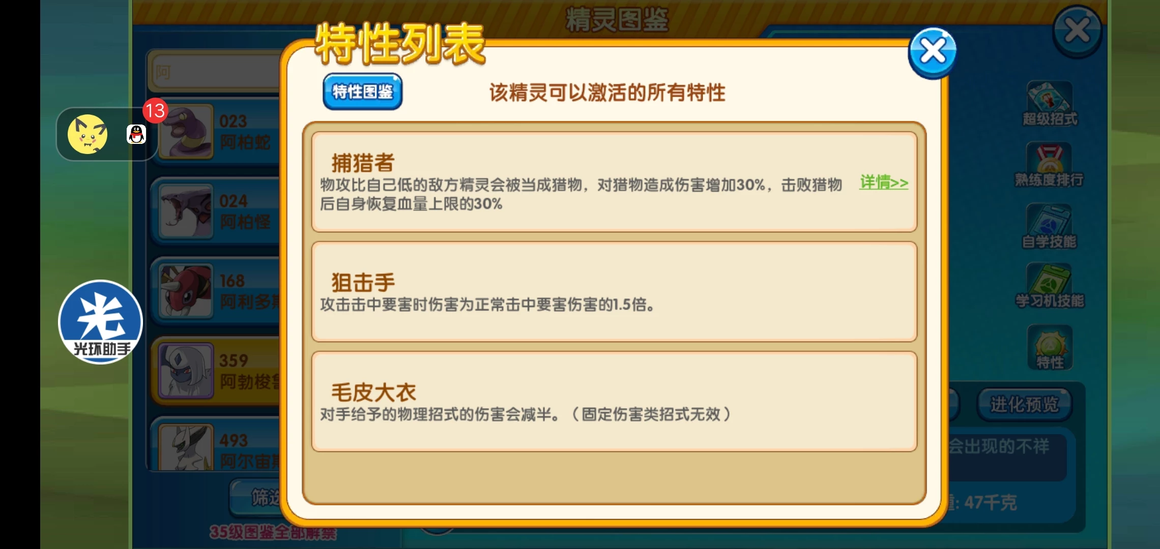 捕猎者:物攻比自己低的敌方精灵会被当成猎物,对猎物造成伤害增加30%,击败猎物后自