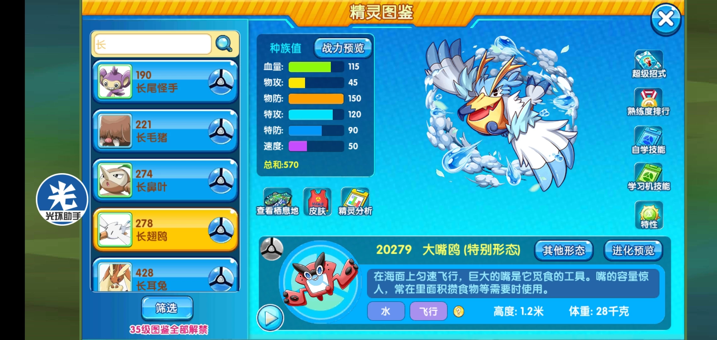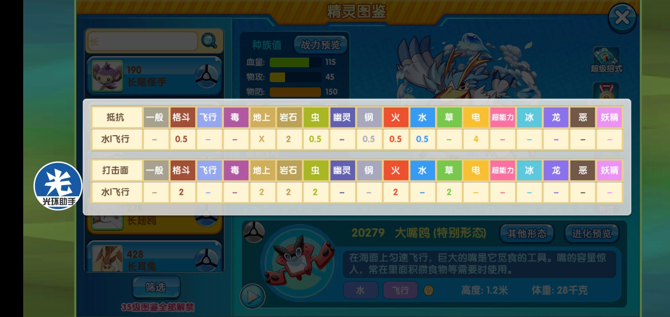 综合说明:在原版中大嘴鸥的存在感就不怎么强,在四代的时候凭借隐藏特性曾经被用来放天气,但效果却不怎么好,在复刻中虽然这次给了mega,但我觉得它的实用性还没蚊香蛙皇强,虽然它的辅助技能也很多,可依然还是不太推荐大家使用。