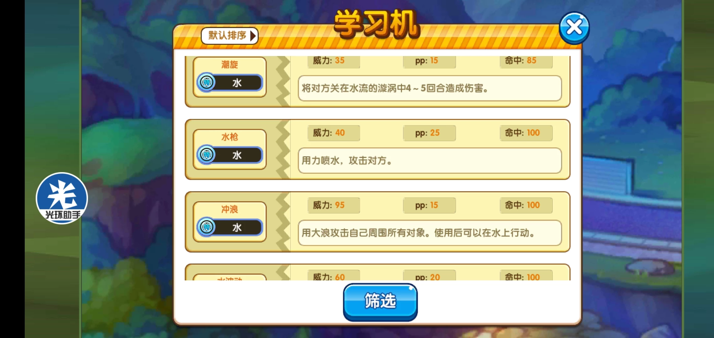泥汤、冻风、急冻光线、守住、急速转变、潮璇、猛毒素、影子分身、冲浪、落拳、破空斩、暴风、歇息、热水、顺风、水柱圈、诡计、清除浓雾、冰冻干燥、超音速飞弹。