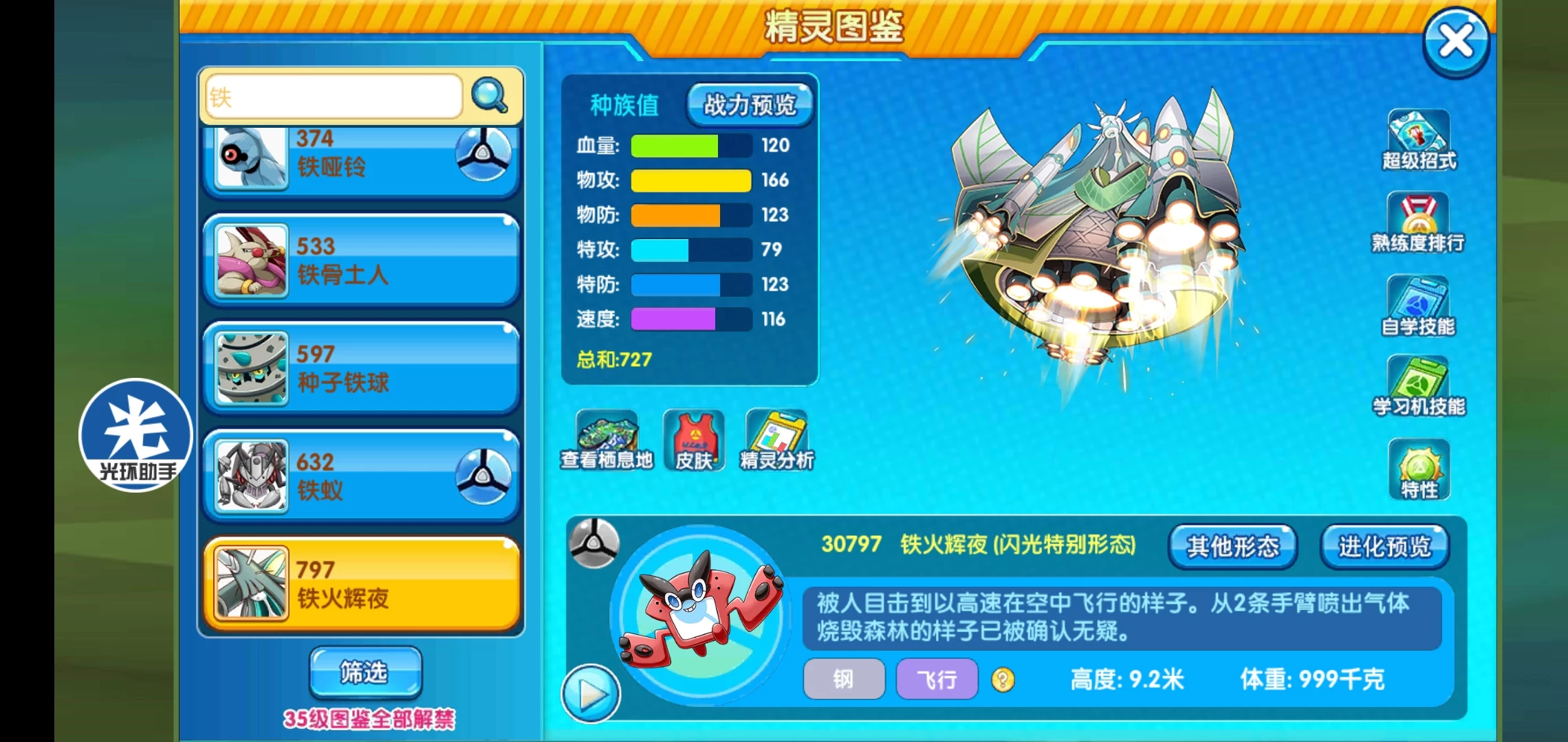 综合说明:这是继闪光纸御剑、闪光四颚针龙还有闪光虚吾伊德之后的又一只闪光究极异兽。其实对于这些究极异兽来说有些强度都不是特别高,没必要不给普通的开放mega形态。不过这次的铁火辉夜感觉还可以,其实钢鸟就凭借钢飞属性火过,抗性很好,但是它具体走输出还是防御,需要个人把握,因为它学习面很宽,而且种族也可以,不管哪个方向都可以。
