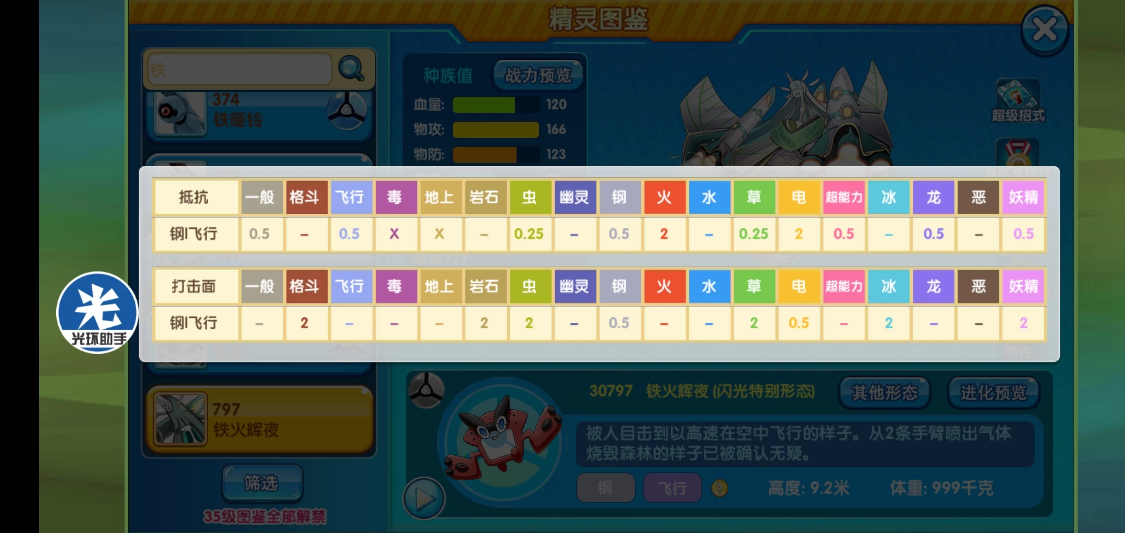 血量和双防都达到120,这已经算是非常优秀的了。没有明显弱项,物攻166,输出还可以,配合特性有第一输出空间,速度116,属于第二梯队,但是可以凭借顺风来达到一速。属性:钢系+飞行系