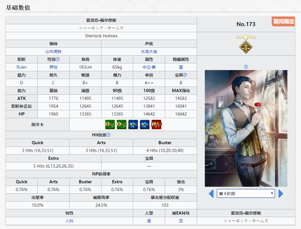 0.76%NP率配合3hits的蓝卡,加上指令卡配卡有二蓝,所以福尔摩斯的NP属于比较优秀的NP率。