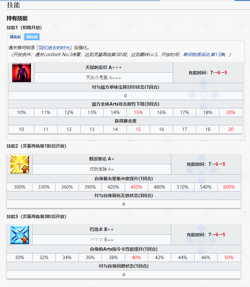 二技能「假设推论 A+」,技能效果赋予自身300%~600%暴击星集中1回合+弱化无效3回合。