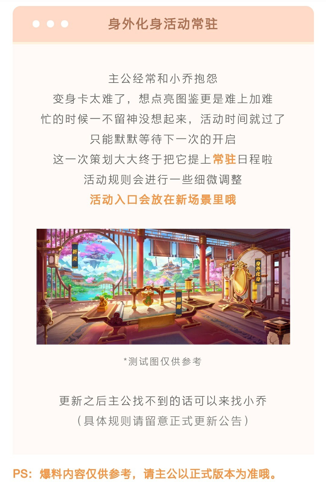 上次被内测服群忽悠,放出假消息,一兴奋就发了出来,这一次鱼头谨慎些,直接上公众号截图,对错也都是官方公众号说的。