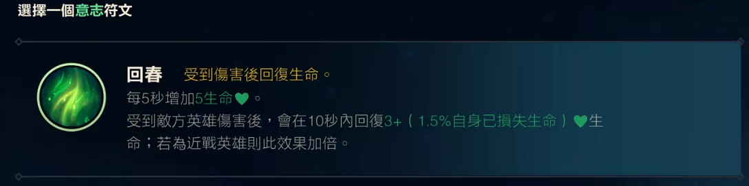 回春有点过强,所以我们要稍微削弱它,好配合其他意志符文的强度。我们还发现它的说明有误,它装备在近战英雄上的效果其实没有说明上写的那么强。我们将修改符文说明,以反映其实际效果。