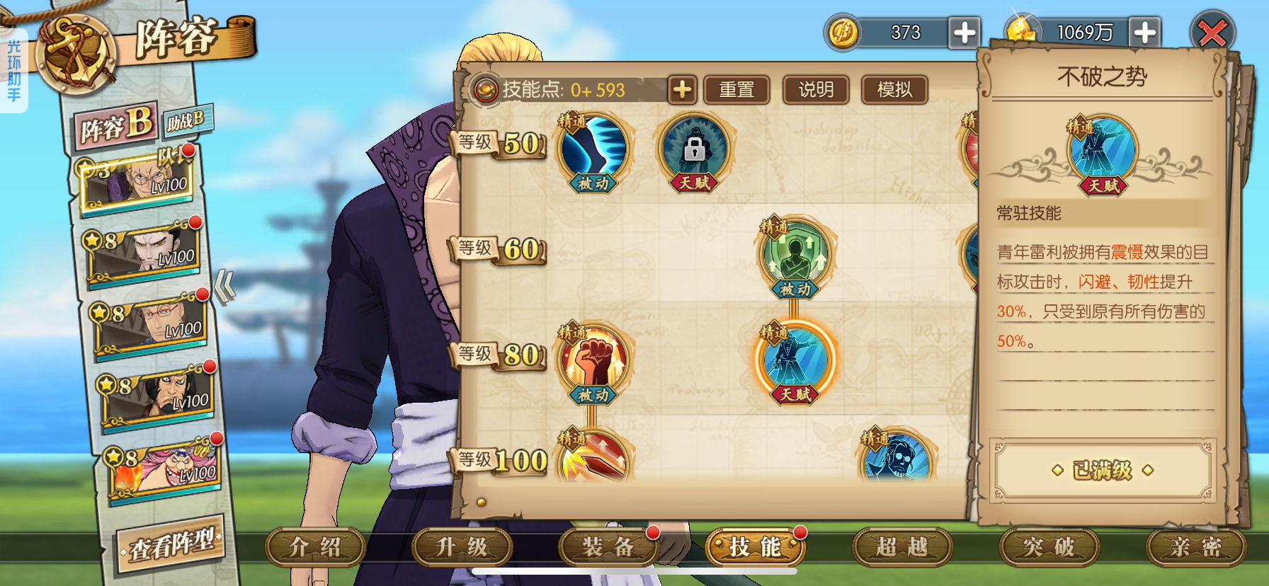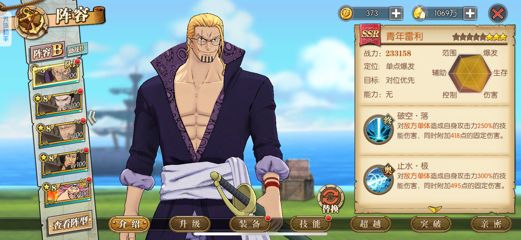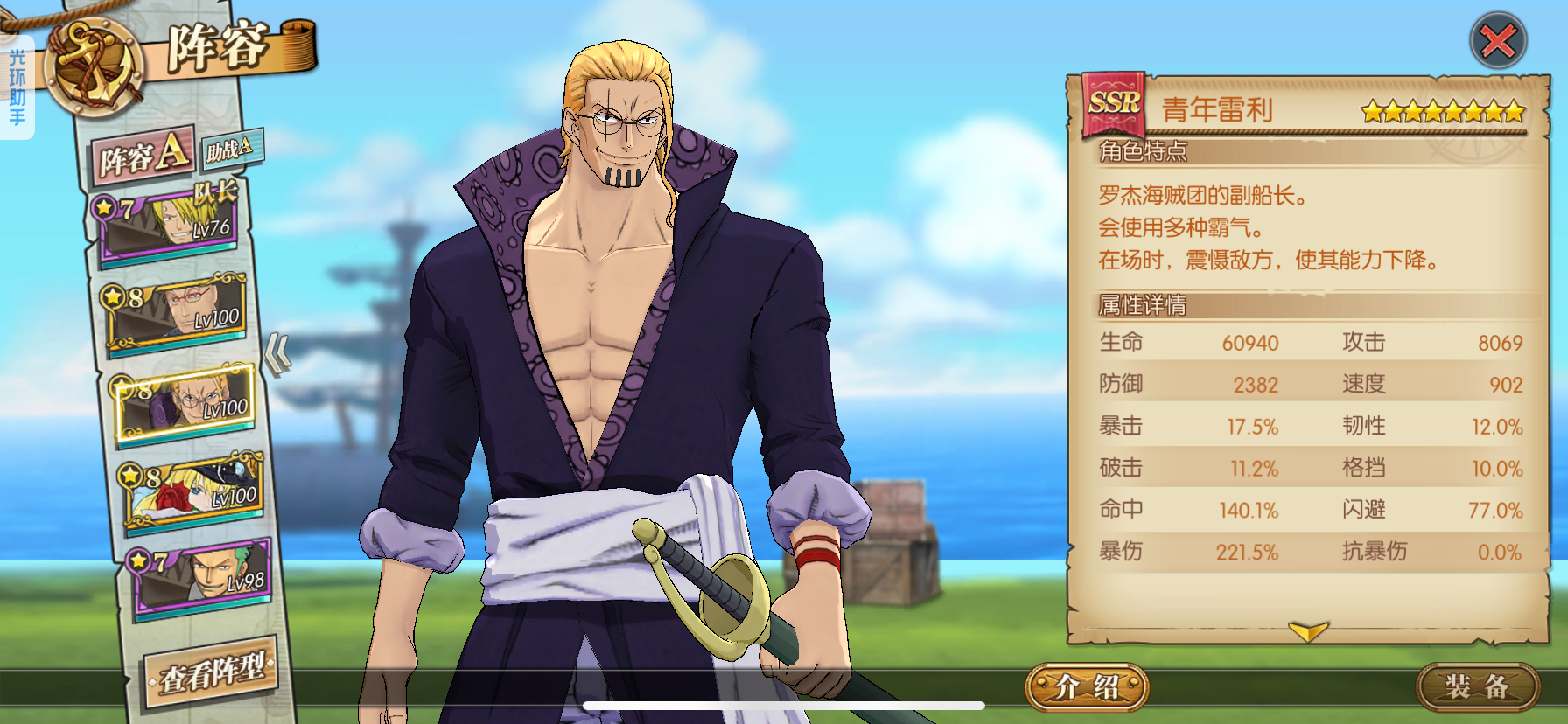 雷利战斗开始100%几率对敌方全体附加“震慑”效果,使其受到的暴击伤害提升50%,并且无法恢复生命,雷利战败后此效果消失。也因为这个“震慑”效果,使得雷利十分克制肉队核心回血人物小马哥,让对手不得不重新玩回输出队,肉坦效果立刻瓦解。
