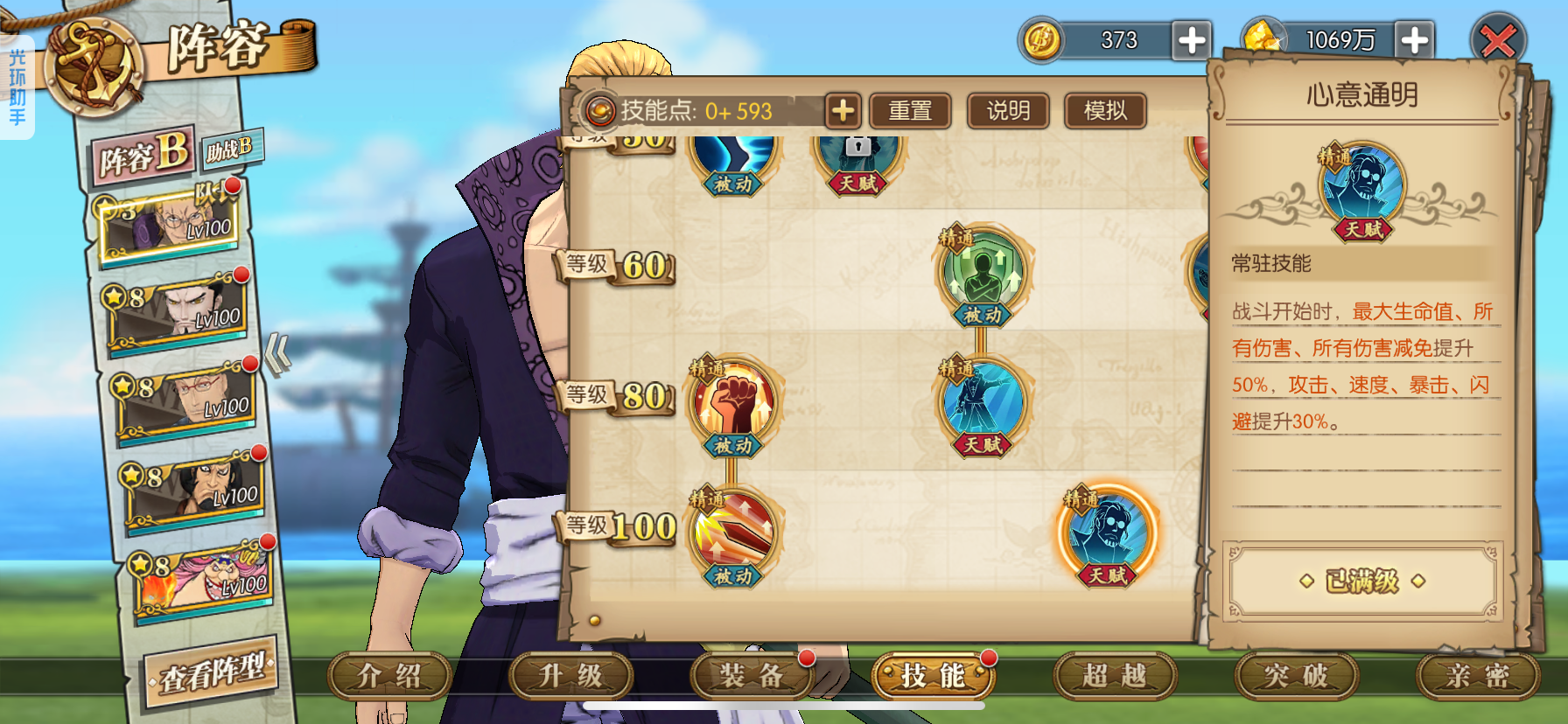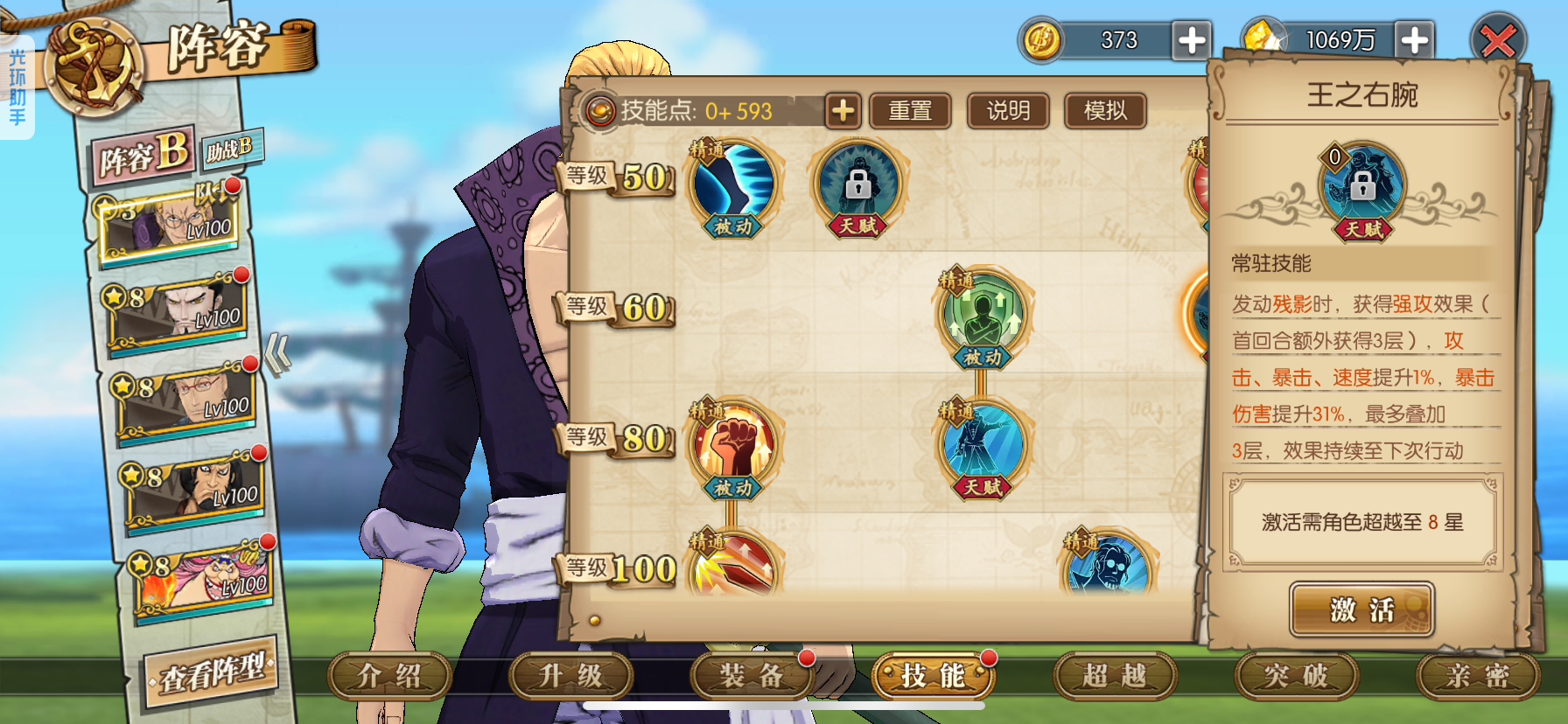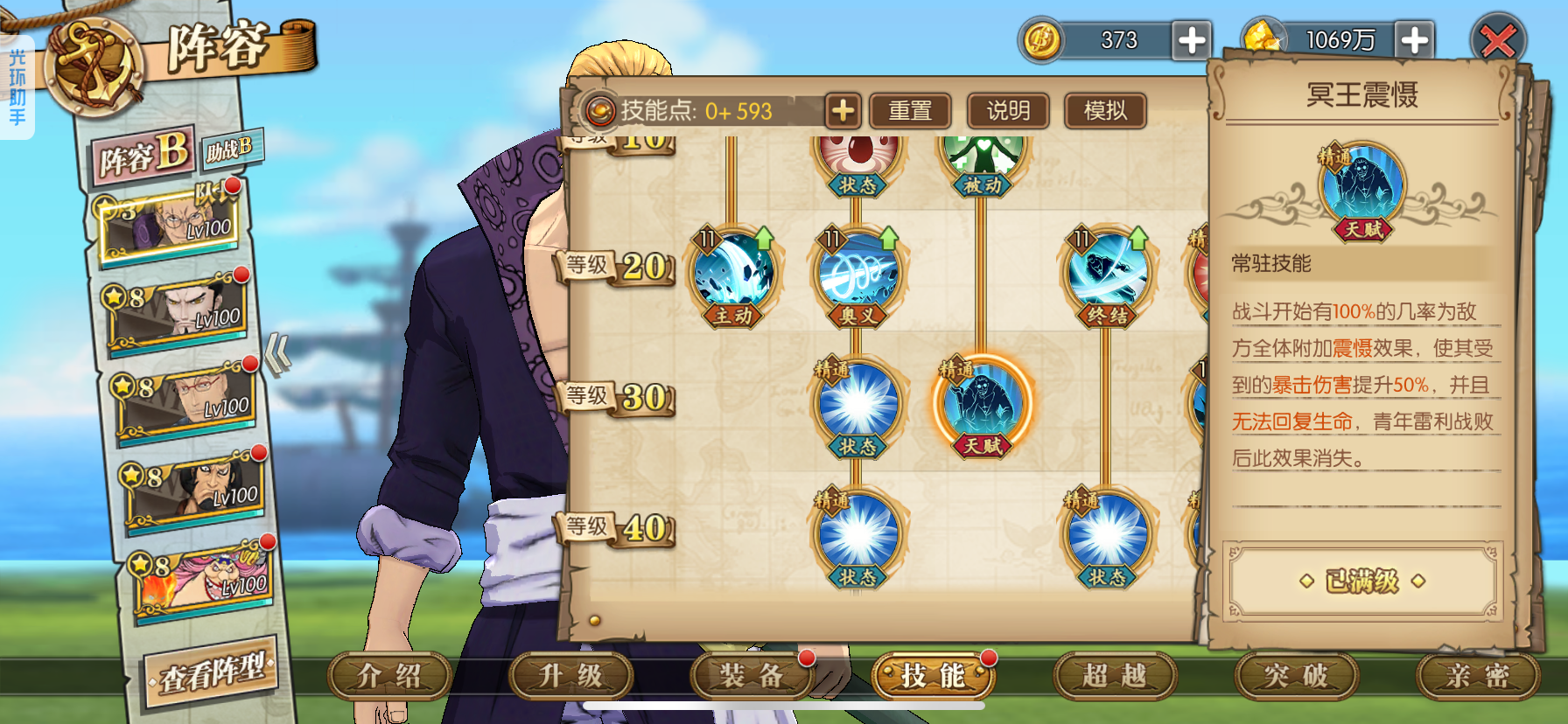 雷利战斗开始100%几率对敌方全体附加“震慑”效果,使其受到的暴击伤害提升50%,并且无法恢复生命,雷利战败后此效果消失。也因为这个“震慑”效果,使得雷利十分克制肉队核心回血人物小马哥,让对手不得不重新玩回输出队,肉坦效果立刻瓦解。