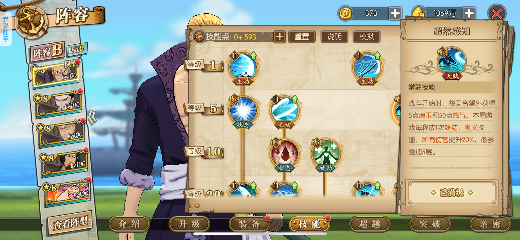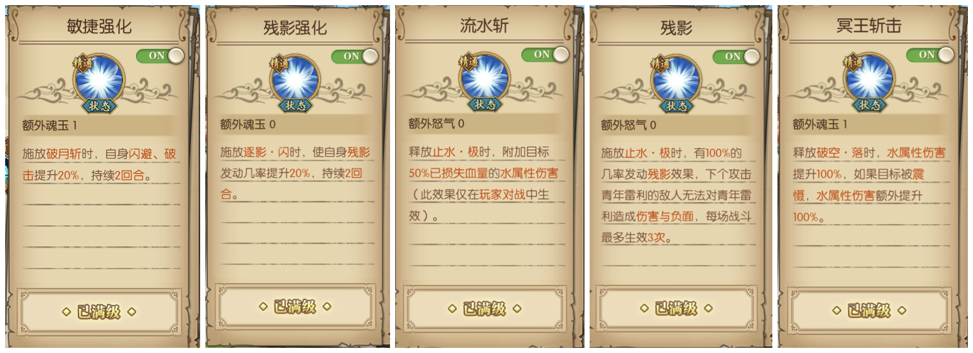 雷利每个回合获得5点魂玉与50点怒气,每释放一次终结或奥义都能提高所有伤害20%,最多提高5层效果,大大提高雷利的输出伤害。