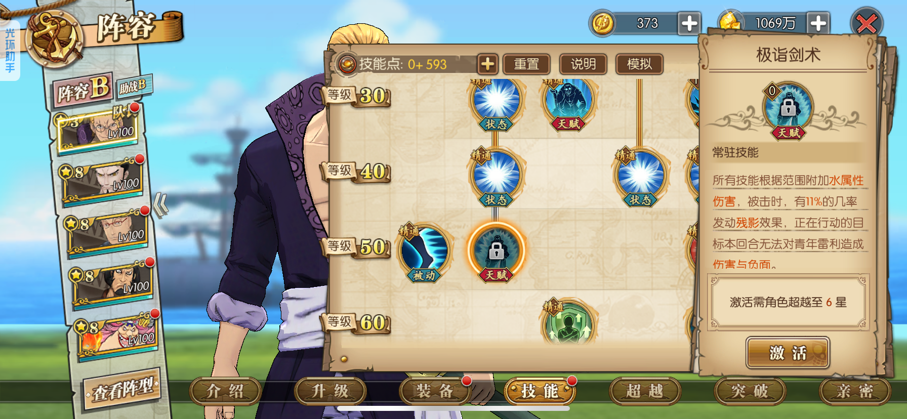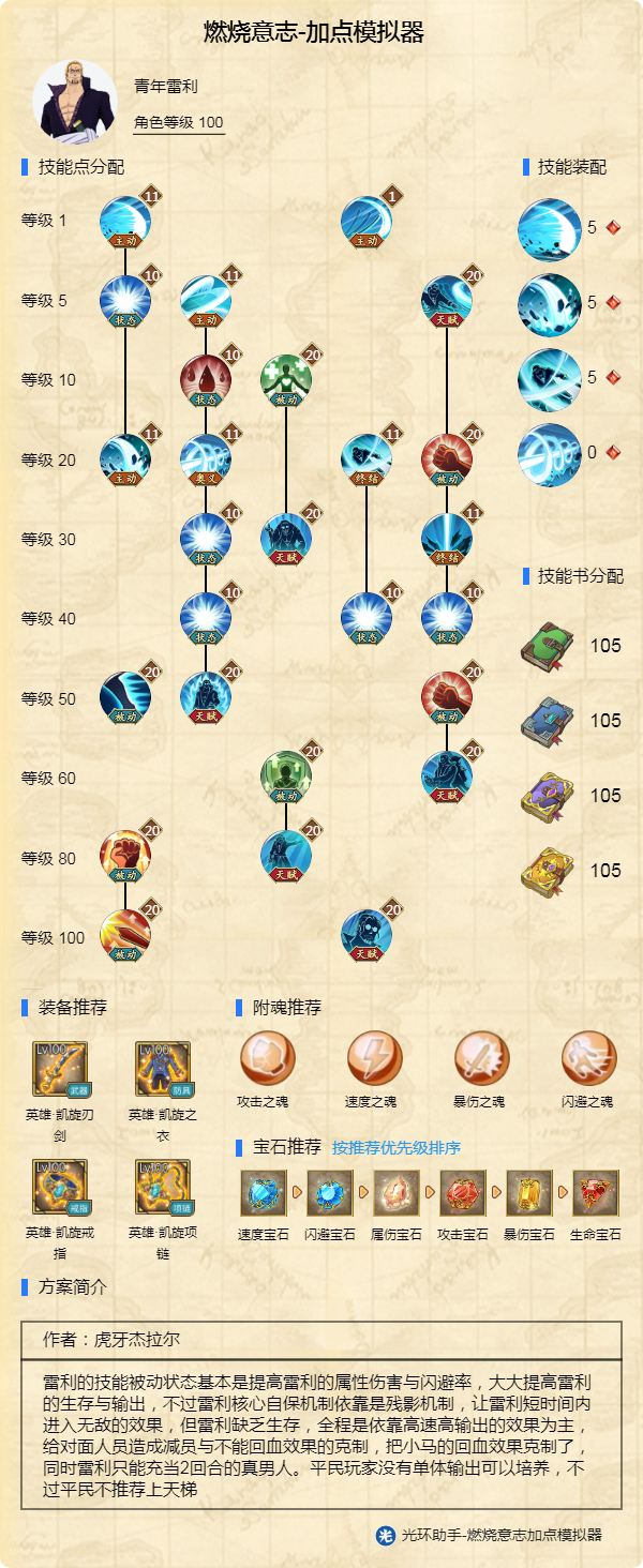 雷利所有技能都附加水属性伤害,同时也是被敌人攻击时,有一定几率发动“残影”效果,正在行动的人物在本回合过程中无法对青年雷利造成伤害与负面。提高雷利生存能力。这个残影的效果跟藤虎的被动免疫伤害效果类似。