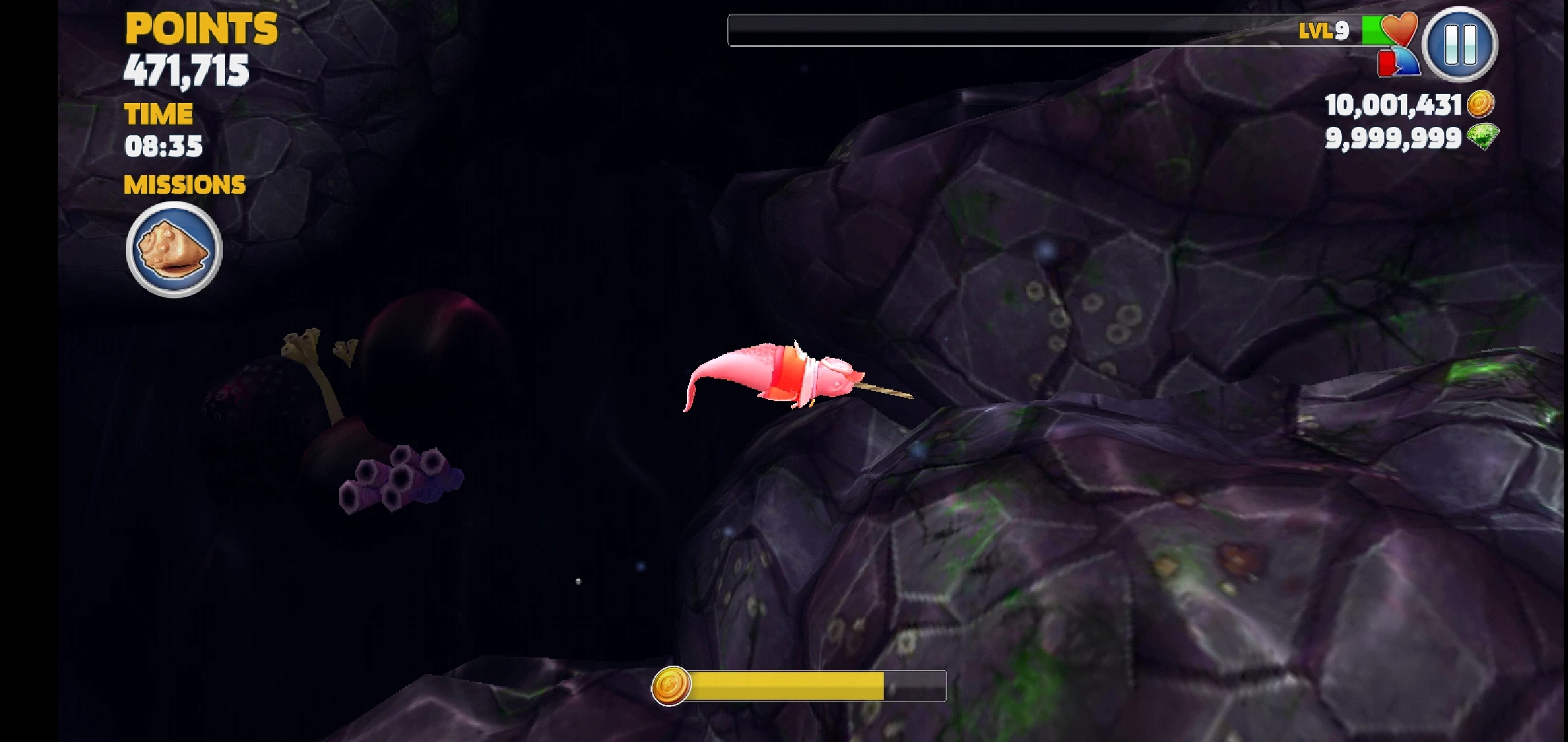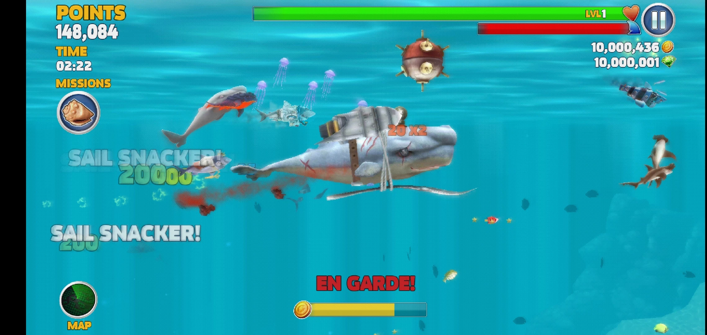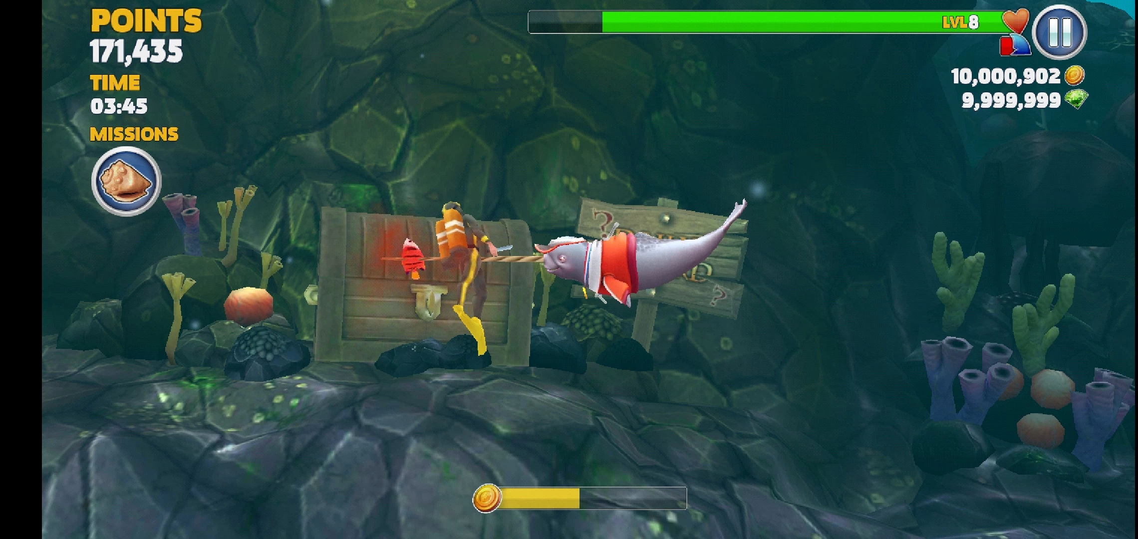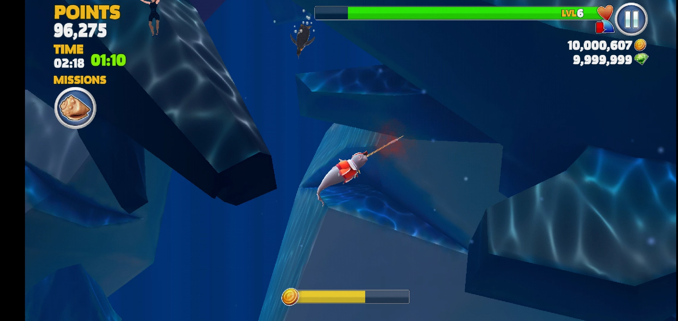游戏中左上角是玩家游戏时长、游戏积分和游戏任务,玩家需要在海洋中不断搜寻来完成任务领取奖励,右上角则是玩家的生命、能量条和金币钻石数,在游戏中玩家需要通过不断进食才能让自己生存下去,否则生命值会不断降低,直至死亡,同时玩家还可以通过能量条来释放道具和能力,让自己在深海中的生存能力得以提升。游戏中玩家任意位置触碰都可以触发能量条,发动技能,也可以触摸任意位置触发轮盘控制方向。