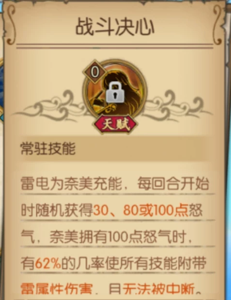 雷电为新世界奈美充能,每回合有几率获得不同程度的怒气,在新世界奈美拥有100点怒气时,释放的所有技能均携带雷属性伤害,且无法被中断。