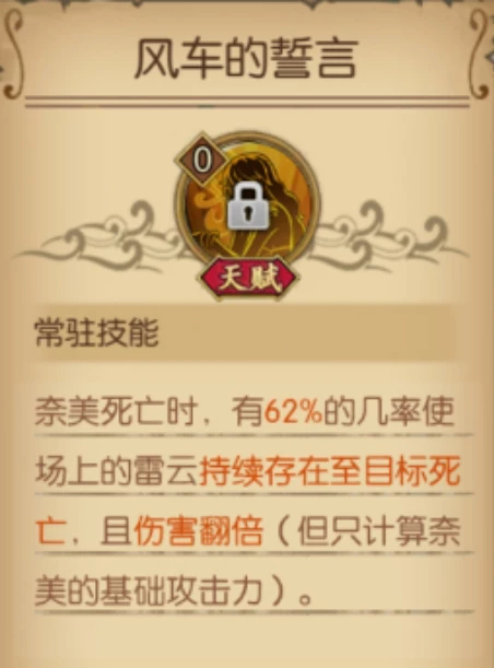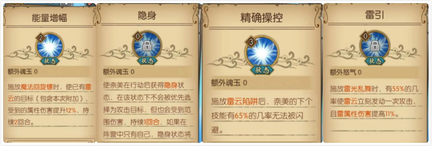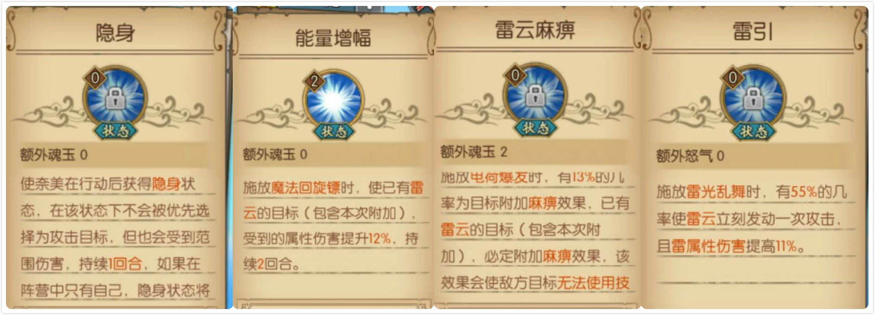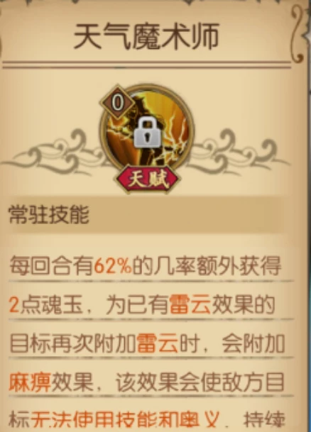 每回合额外获得2点魂玉,为已有雷云效果的目标再次附加雷云时,会为目标附加麻痹效果,持续一回合。