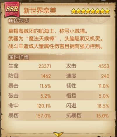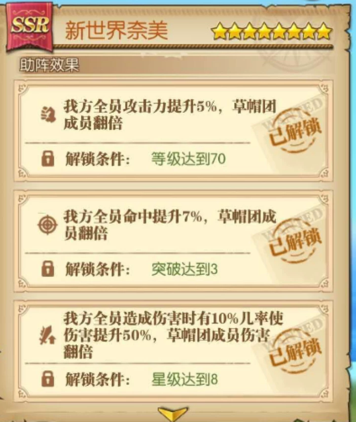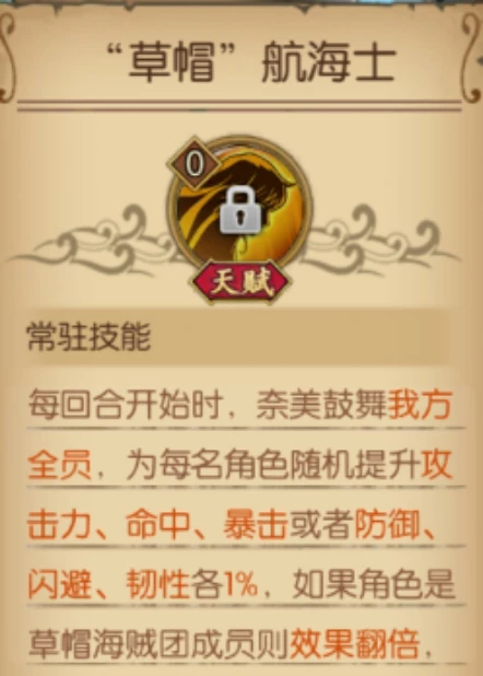 回合开始得到来自新世界奈美的鼓舞,提升攻击、命中、暴击或者防御、闪避、韧性;如果角色是草帽团成员,则效果翻倍!