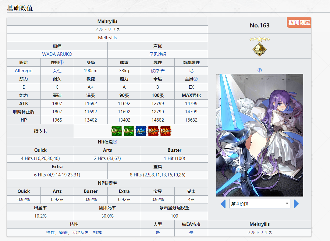 莉莉丝基础NP率为0.92%,指令卡配卡是2红1蓝2绿,红卡1hits、蓝卡2hits、绿卡6hits,宝具是绿卡单体宝具,宝具为8hits。