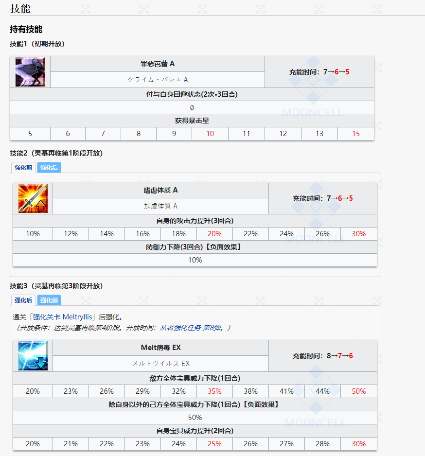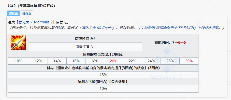 二技能「嗜虐体质 A」,国服未来经过「主线物语 深海电脑乐土」活动强化之后则变成「嗜虐体质 A+」。没强化的时候是赋予自身3回合10%~30%的攻击力提升+降低自身10%防御力3回合,经过技能本强化之后额外加入一个「通常攻击造成伤害前自身暴击威力提升15%3回合」3回合的状态。