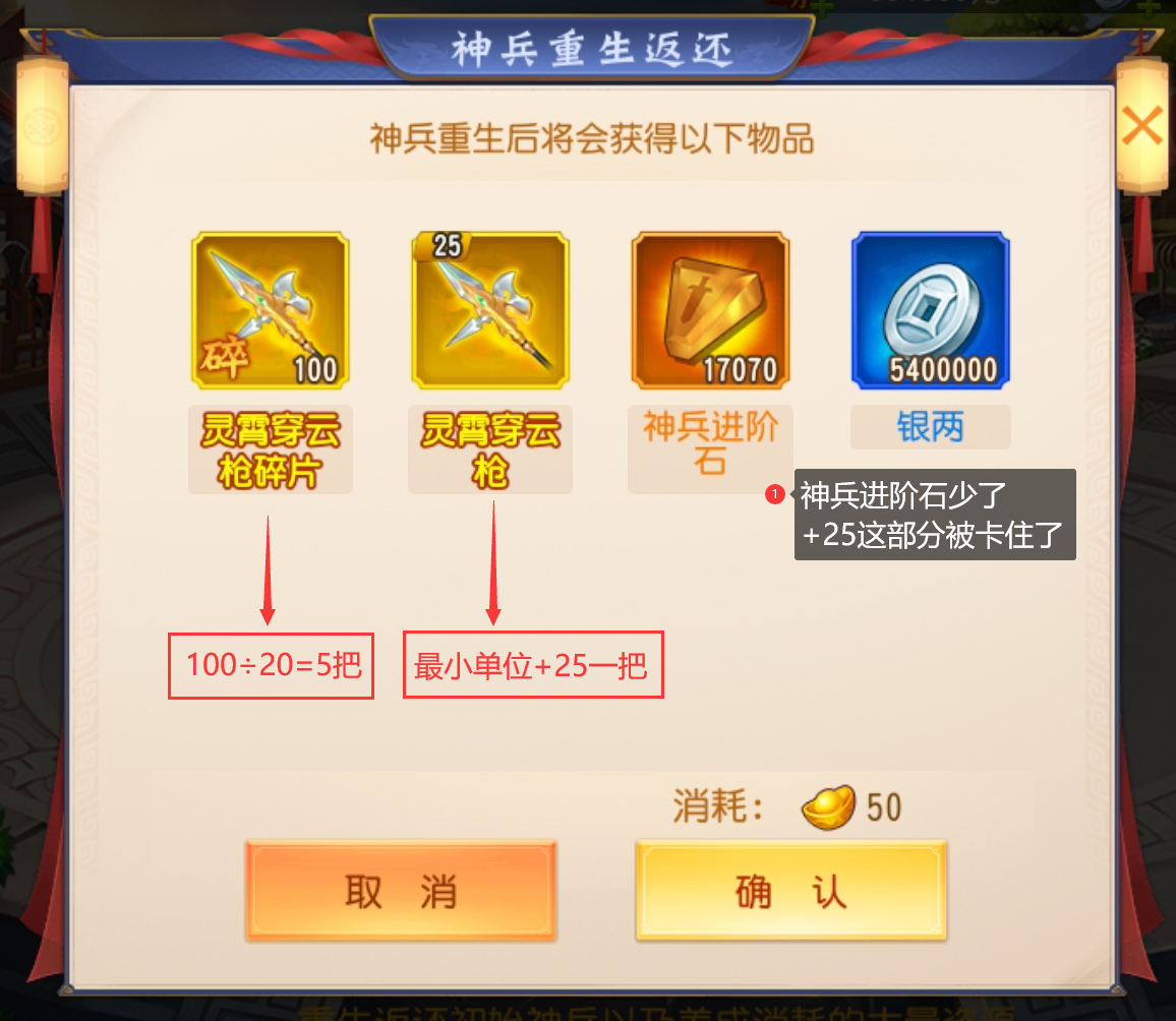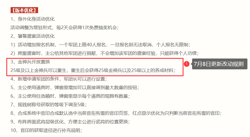 正常来说,只要你不像老哥上面测试的一样,反复去进阶和重生同一把神兵,那么对你而言不管是主力输出、次主力输出还是辅助武将,他们的神兵都亏不到哪里去;但是要注意的是,检查下背包,更新前把多余的精炼到+25以上的神兵全部重生掉,如果你看到这篇文章的时候已经是7月8日更新完了,那也无需紧张,只需要知道你亏了什么就够了。那究竟亏损了那部分资源?答案是被卡住的进阶石和置换合并的神兵;神兵进阶石也很容易理解,领了一些金将用来开名将册,但是并不打算培养的,得到的+25神兵重生掉,这里是有进阶石收益的;置换合并的亏损,举例说明假设你有子上和水镜两个武将的神兵都是+50,现在想弃水镜只养子上,水镜和他的神兵都置换过去,武将可以合并,但是神兵由于+25无法重生的机制,就会废掉一把子上+25的神兵。