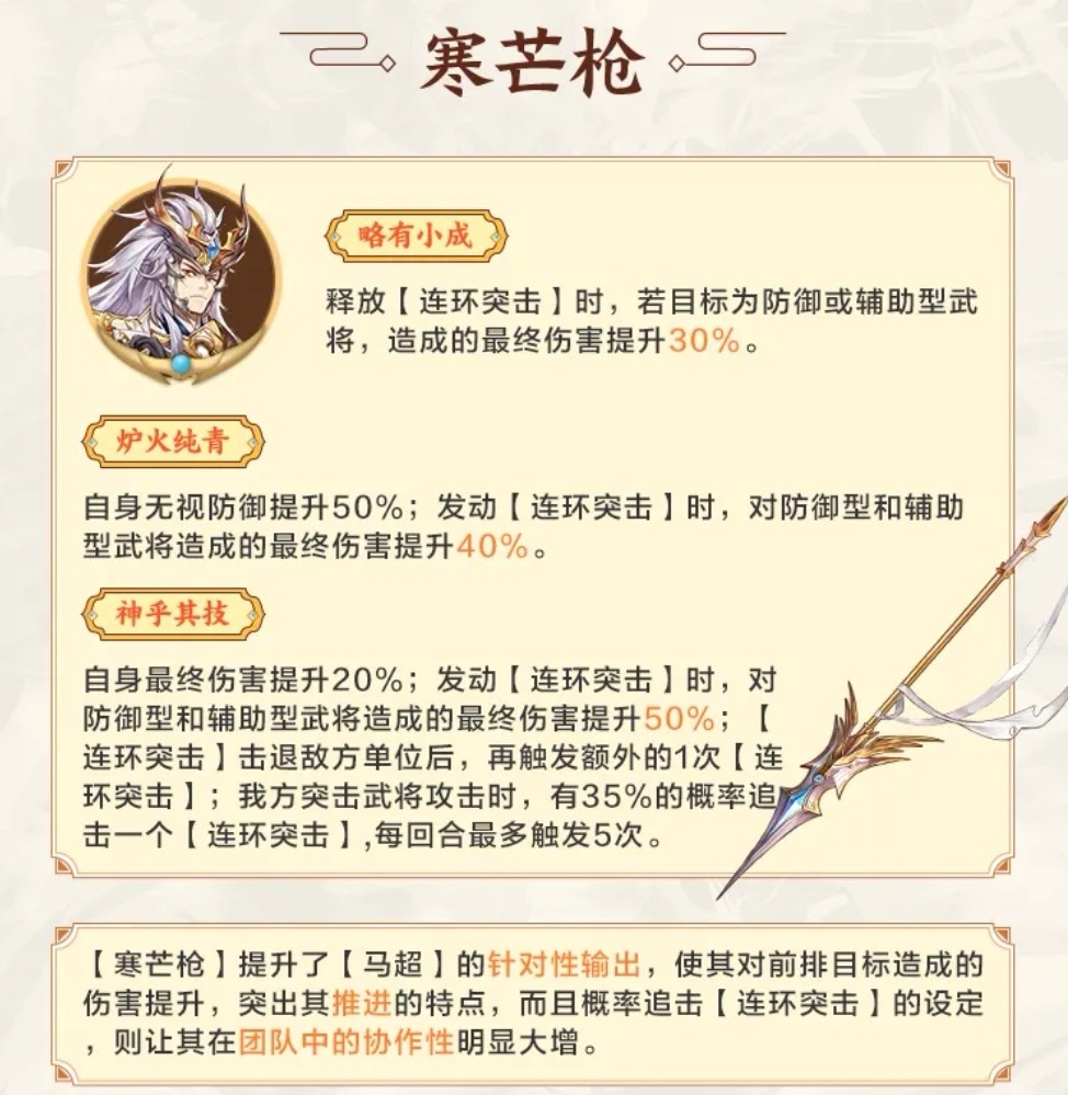 大方向来说 马超出了名的“拆迁户” 老版本的过前排能力很强 但后续各个版本的改动(阵法 新武将 灵宠)马超作为老武将的劣势就变成无法上阵的硬伤了 这次专武一定幅度提升了马超的过墙能力(主流阵容 辅助将前排居多)且追击机制的新设定 马超未来在切后体系中能成为节奏点之一
