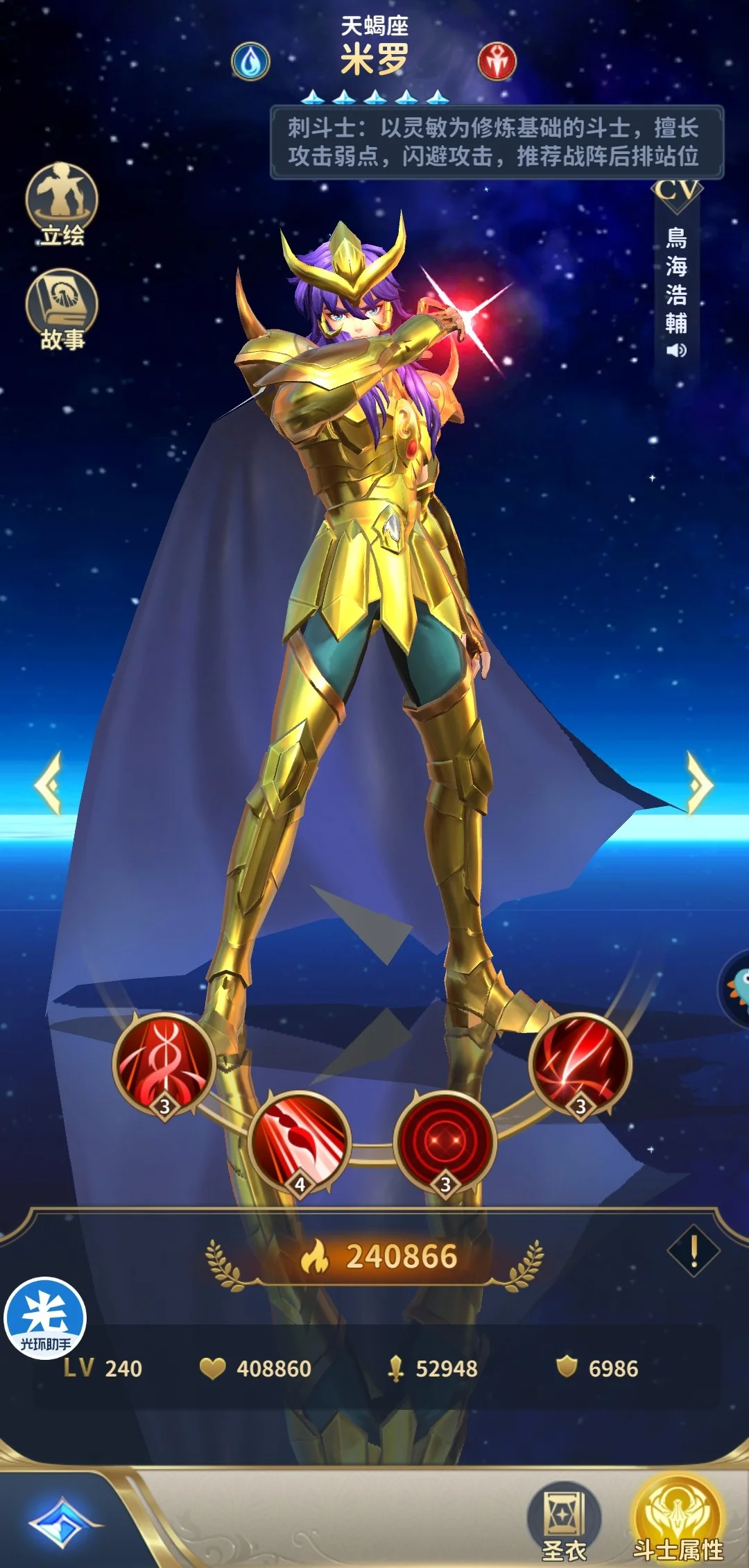 很多时候,我们第一次十连抽到的圣斗士会是天蝎座米罗,怎么说呢,其实天蝎座并不差,以敏捷攻击为特点,单体攻击为主,前期的话很弱,也许后期会很强。