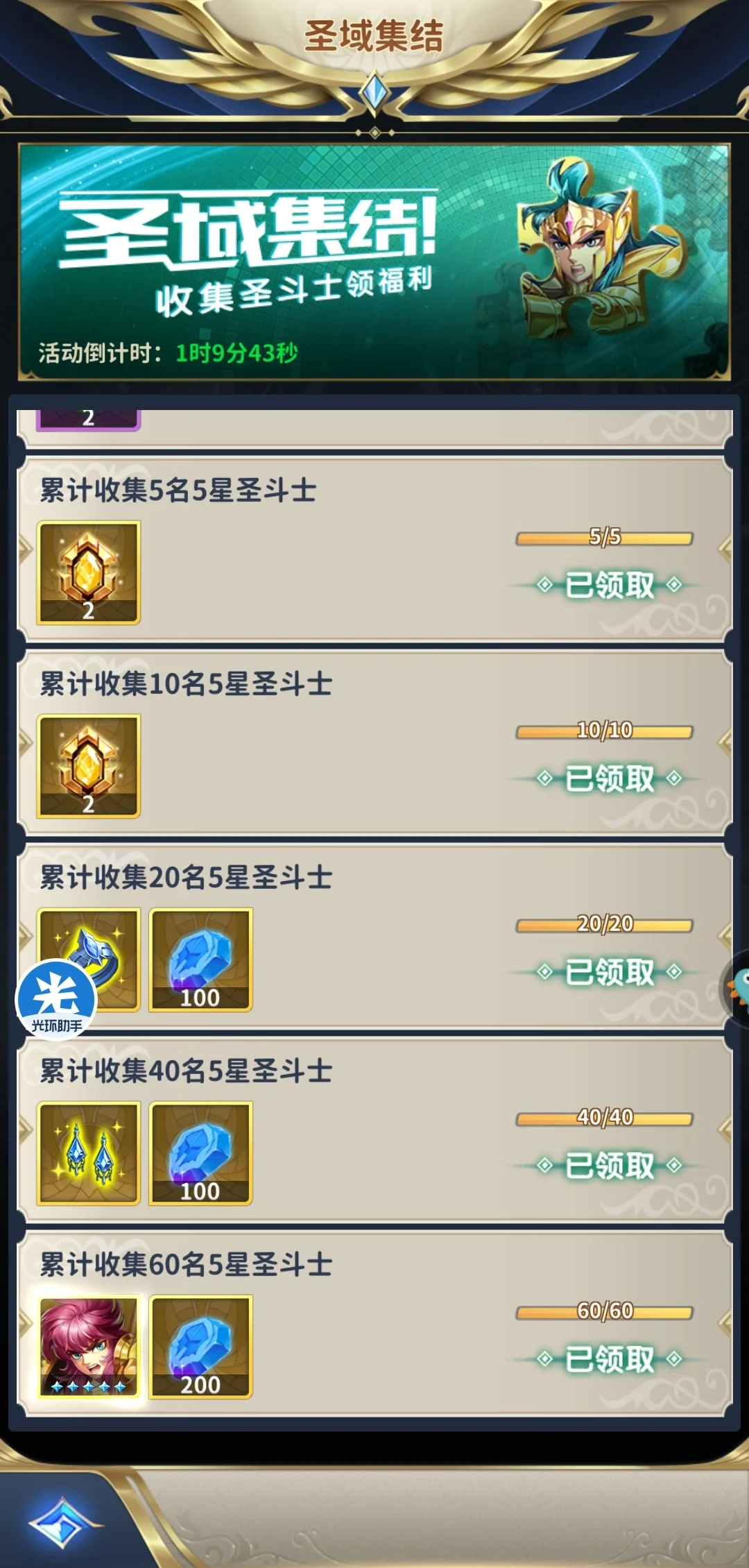 第一个黄金圣斗士的获得很简单,只要完成新手任务,获得一次十连,必定会招募出一个黄金圣斗士,如果下了光环助手,开15倍的加速,几分钟就可以完成。