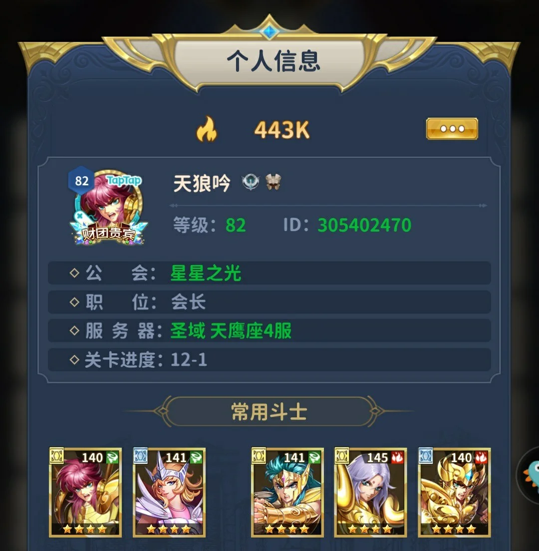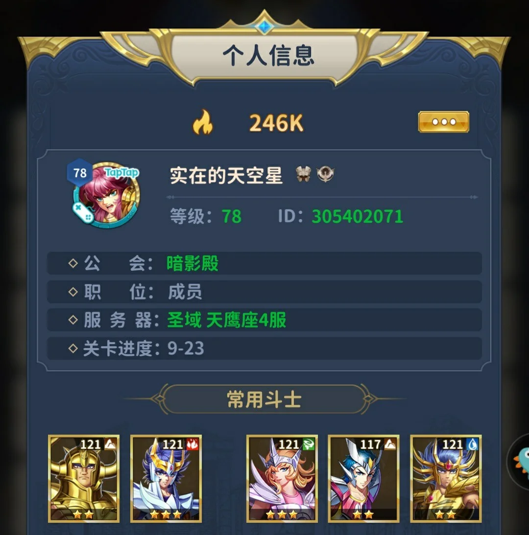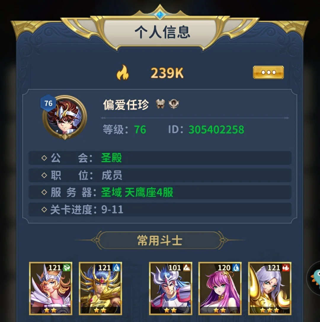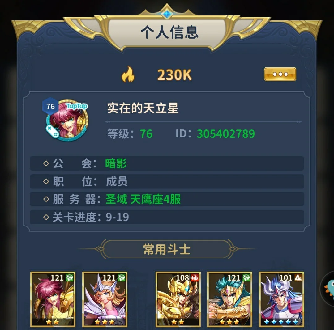 战绩还不错,推图、异次元空间都可以上前十,所以只要狮子座配合一辉加上一个武仙座,用上雅典娜,灵活调整剩下的一个圣斗士,还是非常给力的。