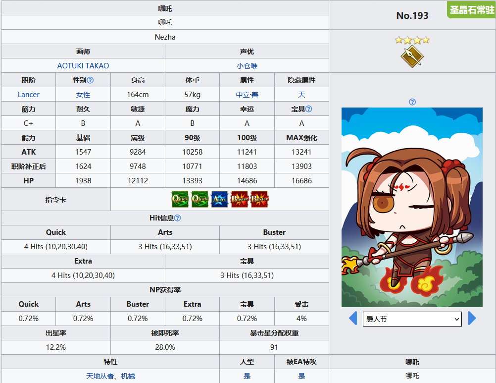 秉承着上三职阶高面板的传统,哪吒的atk和hp在所有四星里是属于上游的水准的,配卡双绿双红一蓝,标准的枪阶配卡,np率很不错,绿卡可以用来打星打np,蓝卡打np效果更棒。其余就要来看看技能组和宝具。