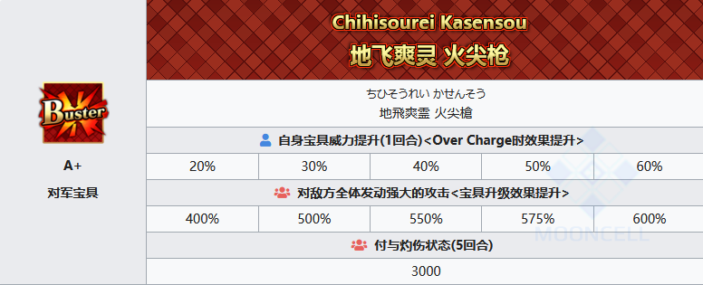 地飞爽灵 火尖枪 自身宝具威力提升(1回合)对敌发动全体强大攻击 赋予灼伤状态(5回合)红卡光炮,前置的宝具威力提升很低,不过聊胜于无,此伤害倍率和灼伤伤害都是强化后的版本,强化前倍率皆少100%,灼伤伤害也只有一千,当初哪吒刚刚实装的时候,那可真的是惨不忍睹,就我二宝使用的感觉来评价,真真正正的水枪,可能是枪阶里伤害最低的了,不过此强化后的版本也能算是中游可用的水平了。