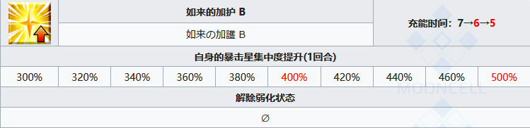暴击星集中配合一技能和哪吒自己的配卡效果很不错,本身权重就高,抢星没问题,能做到自给自足打暴击,但只有一回合就很可惜。解除弱化状态在整个fgo技能里都算是好的。