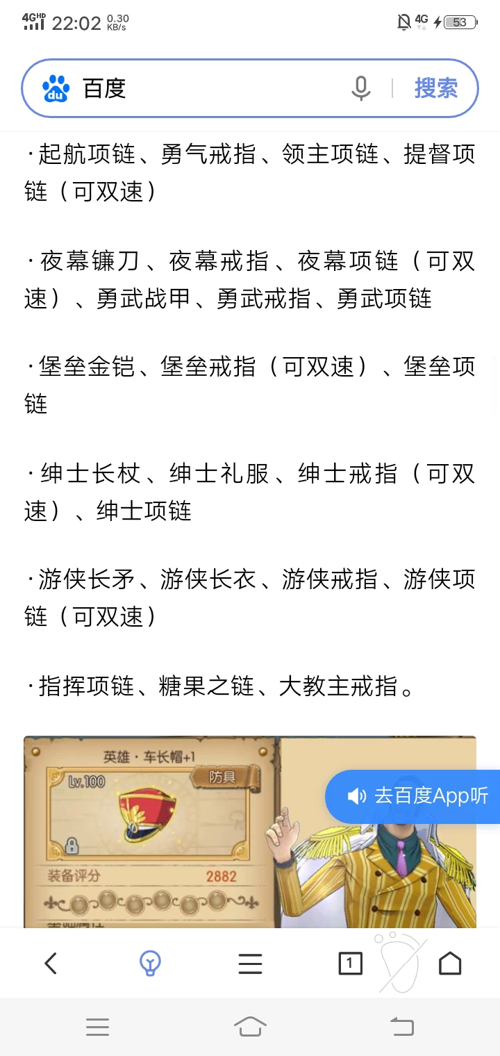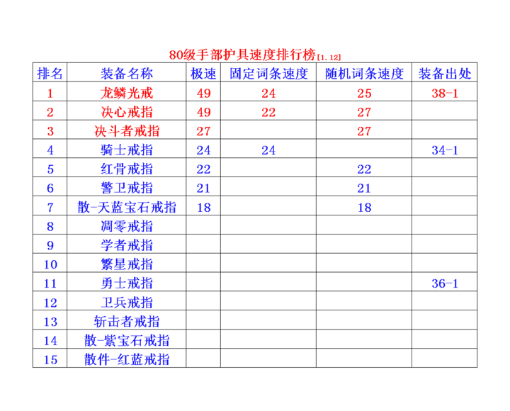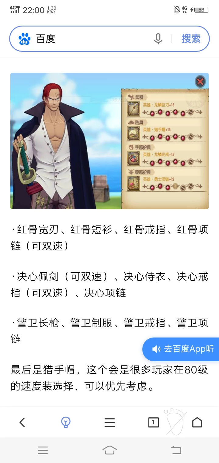 。关于那个警卫套有条件的可以搞一套。给索隆黑胡子红发花剑都可以,每回合奥义使PvE变得更加轻松。到100级的话就可以弃了。毕竟属性还是不如百级装备。天梯里面的那个凋零套装性价比不高。不太推荐。目前80级主流就是速度散装。天梯必备。我说的这四个都可以在剧情回顾里找到。平民不氪金就可以得到。每天刷两次,一周左右,运气好就可以刷出来两三件。如果都刷出来了就开始打孔。猎手帽和勇气戒指可以用到后期。照样通用。不过是把龙鳞二件套换成绅士二件套。属性提高了一些。就讲这些。