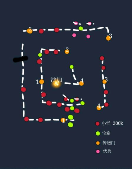 沿着路线走,除了划线的两个伏兵和两个小怪不打!血量是刚好够打沙加的!!技能一定要手动释放,血满时不要放奶技能,尽量把输出技能留给下一个怪。
