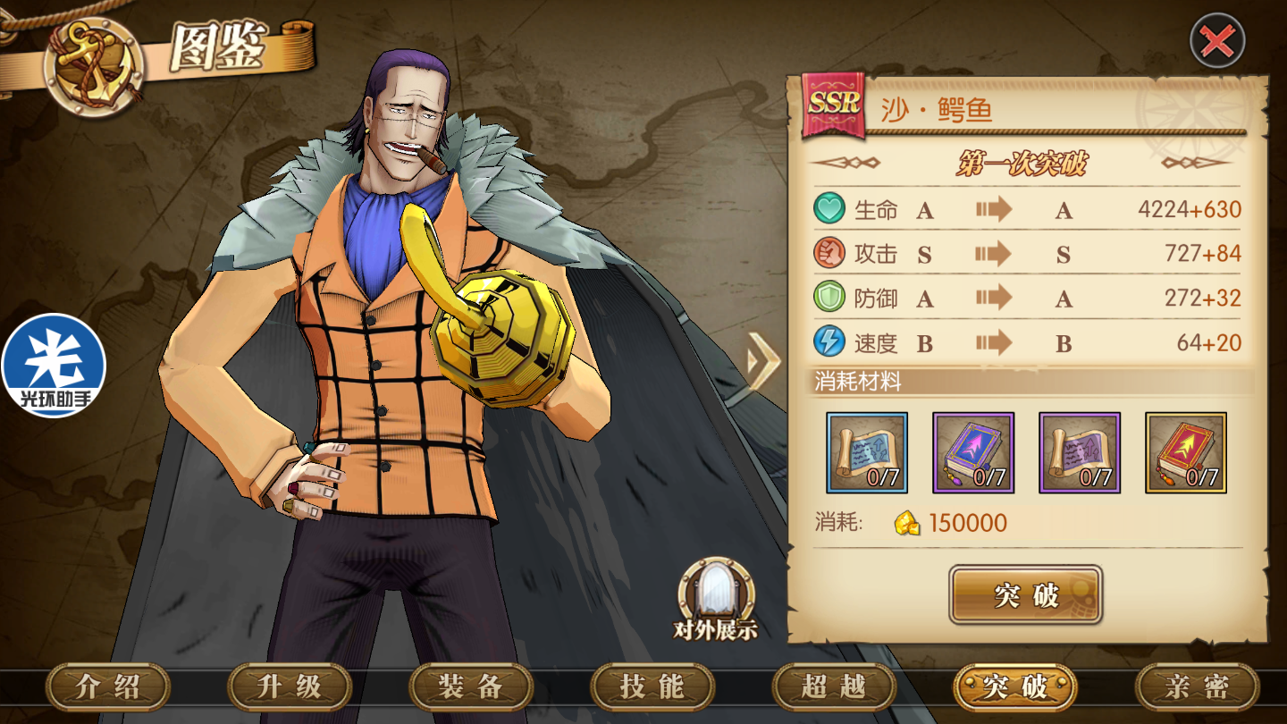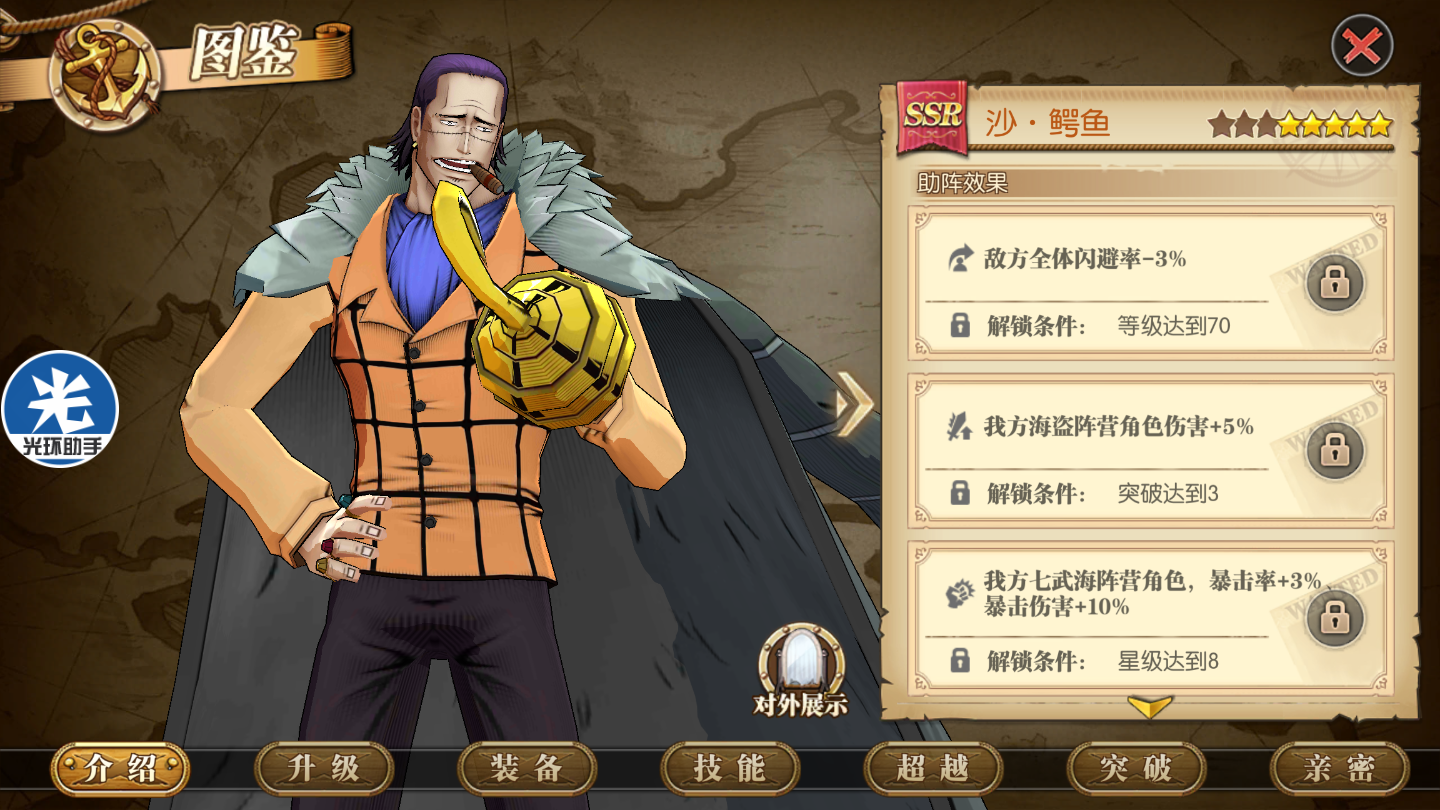 七武海版本的buff角色,增加大量暴击爆伤,同时能降低对方的命中和闪避,但适用性较窄,其他队伍不太适合。对平民来说,40级起步,60级上场,八星完整。