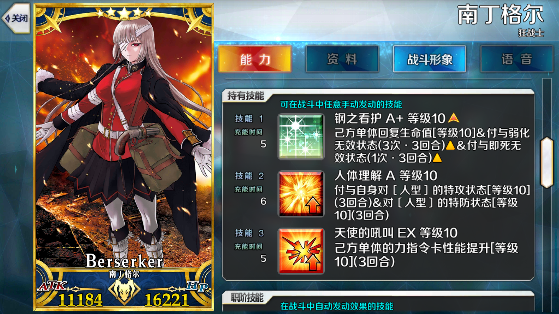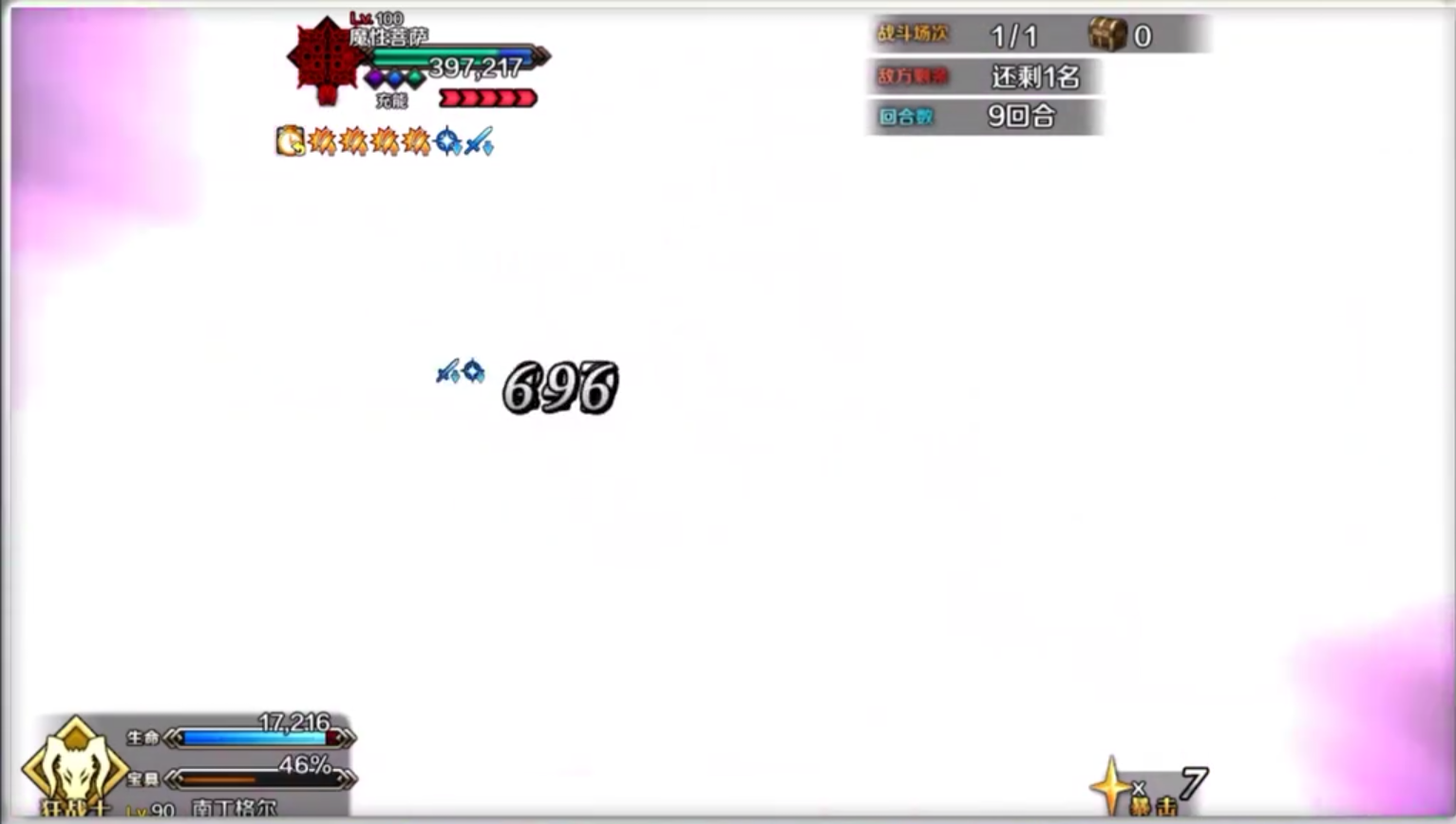 敌方第三管血破了后会给我方蓝魔放降低10回合,这个最好用1技能或者衣服解弱体解掉。因为南丁单挑靠的是宝具来对抗杀生院的宝伤,蓝魔放被降低,那么就会影响南丁的攒宝具的效率。