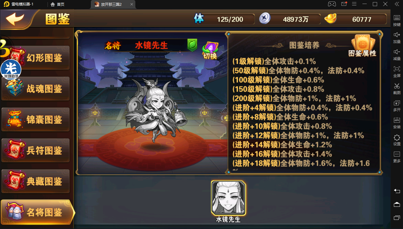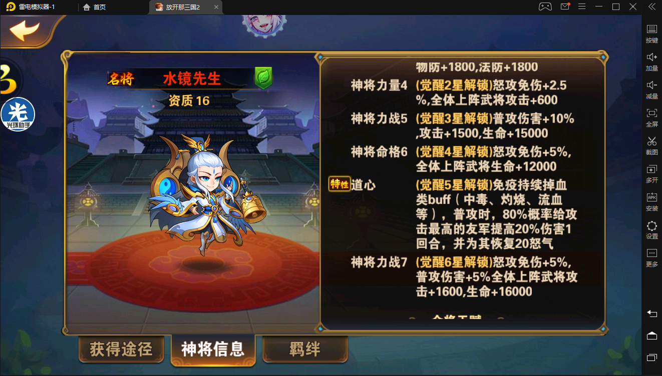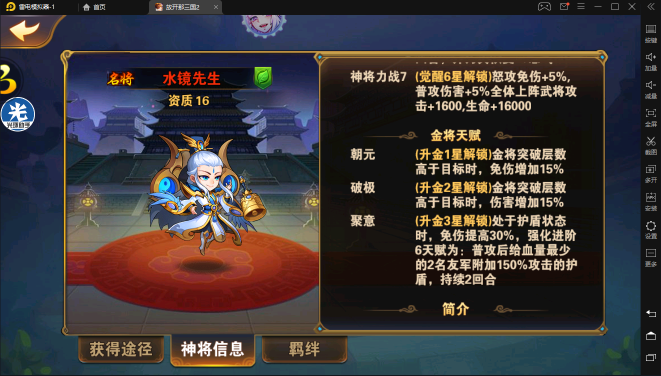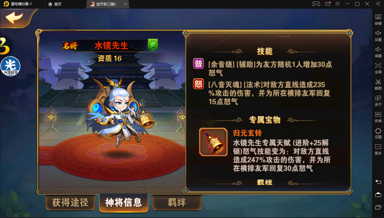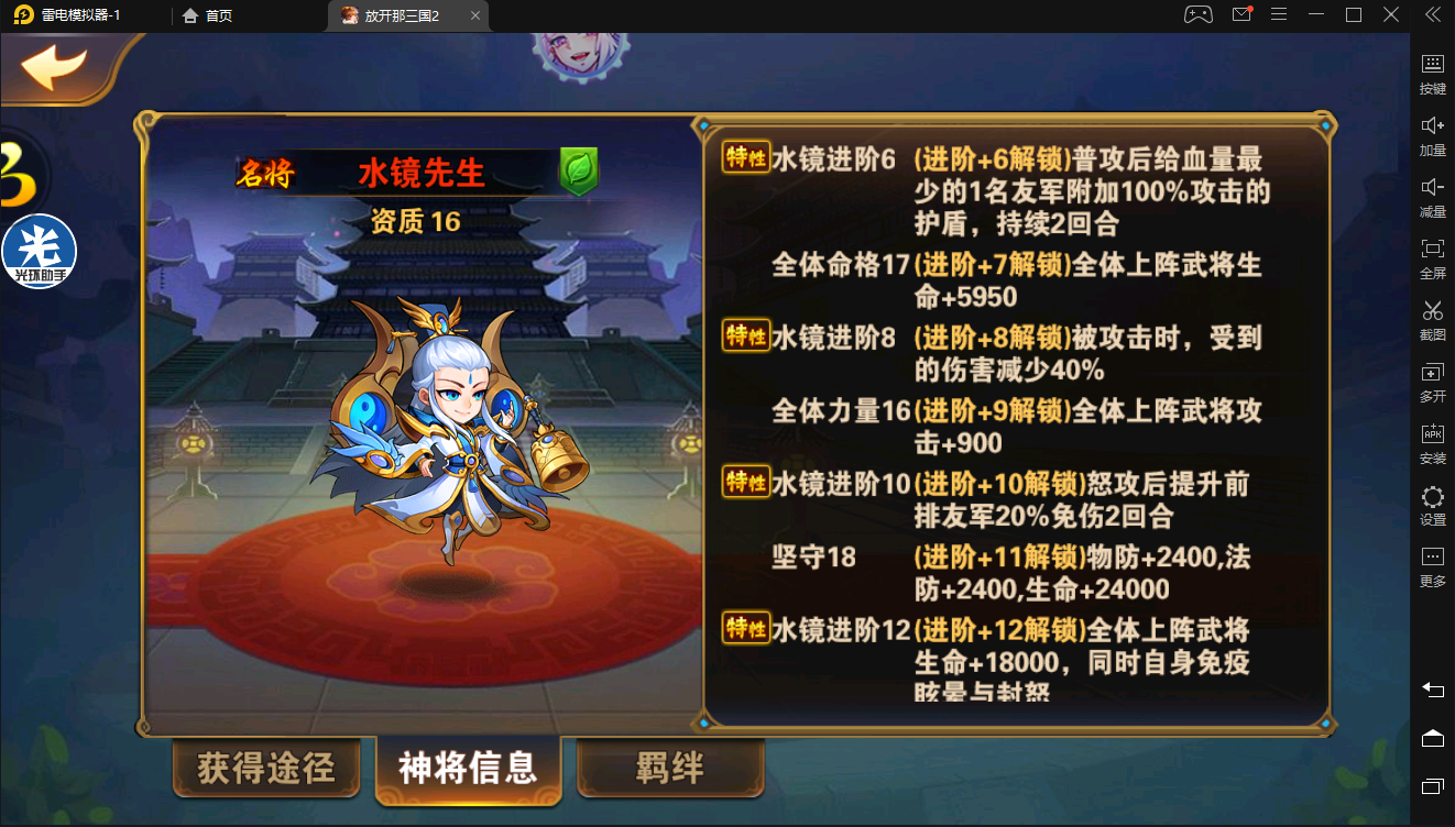 水镜先生特点:拥有专属光环,独立羁绊,属于回怒型辅助武将,进阶需要消耗进阶丹,名将血晶石和本体。