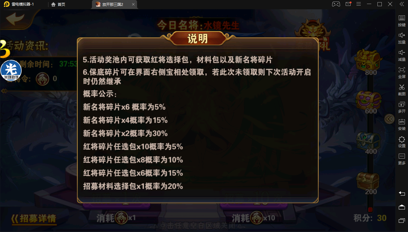获取方式:每日完成一定数量日常可以获得4枚名将令,或者充值获得。抽奖概率在图下,总体来说,概率是偏低的。