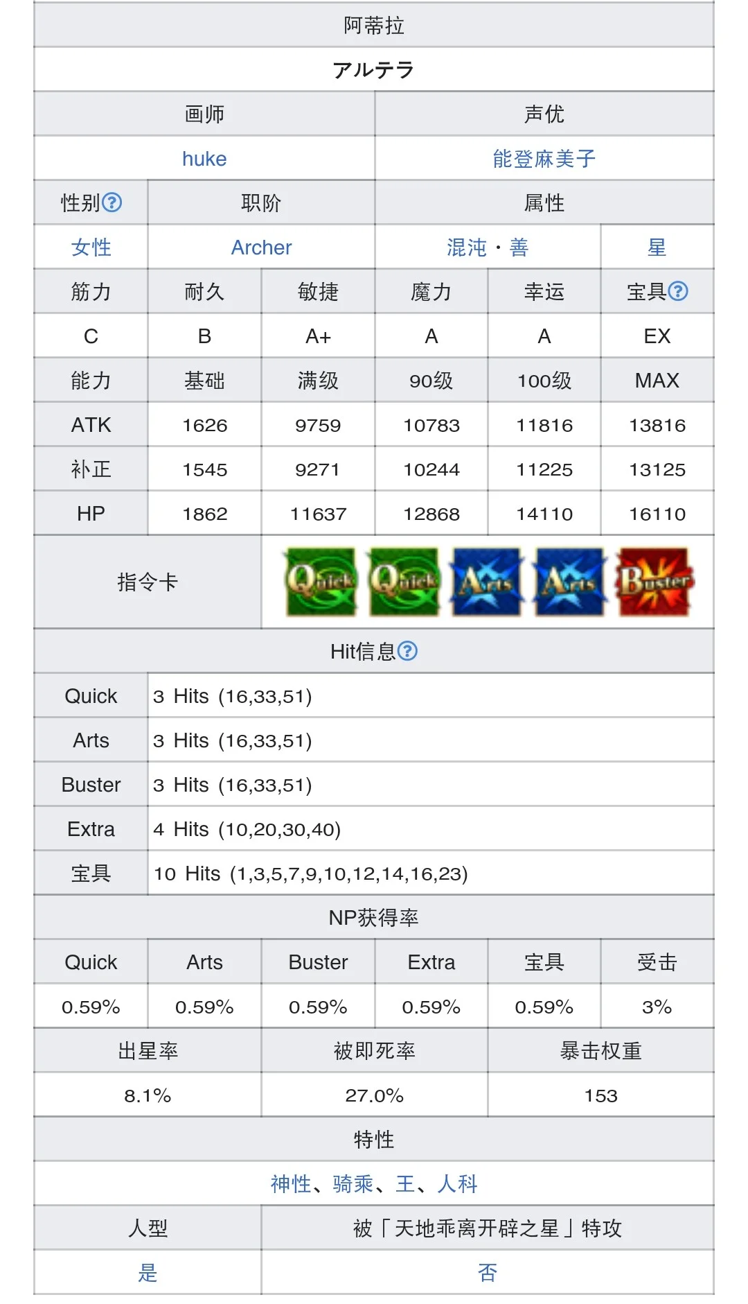 绿卡单体的宝具,有着10Hits的多段攻击次数,配合出星率8.1%让阿蒂拉的宝具打星能力很高。然而指令卡np率只有0.59%,蓝卡绿卡都是3Hits,普攻np回收比较一般,只有宝具因为10Hits有不错np回收。攻击力因为弓阶攻击力补正是0.95,满级9759的攻击力面板然而实际攻击只有9271。