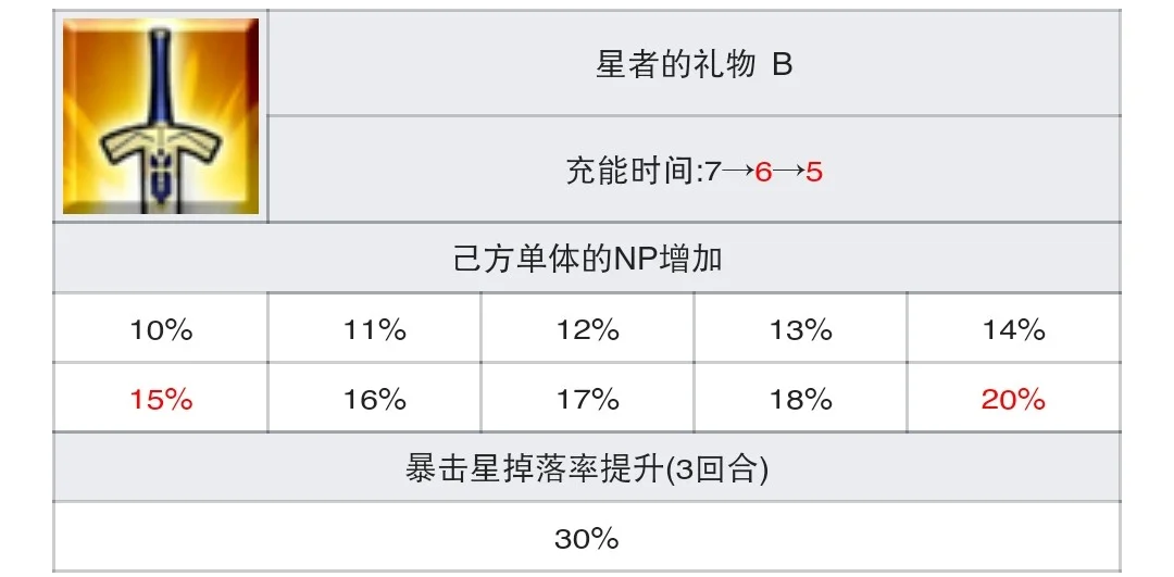 满级己方20np充能单冲和30暴击星掉落率,既可以辅助也可以自用,20np正好可以配合万华镜礼装达成100np启动宝具。没有满破万华镜的玩家很值得十级配合万华镜启动宝具。