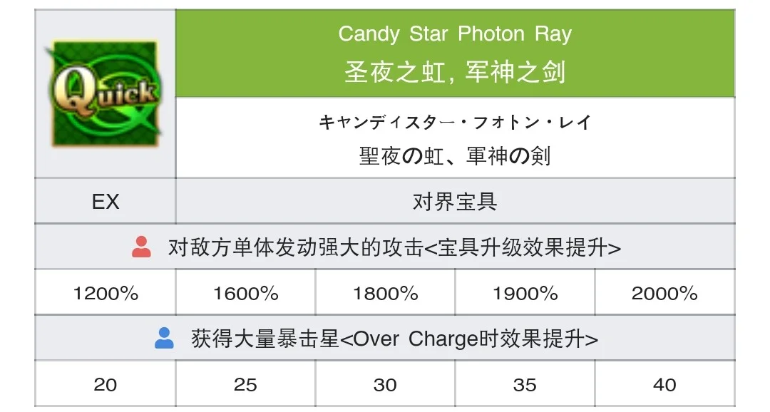 宝具优点是白嫖五宝伤害很高,宝具10Hits配合一技能有30出星率,再配合宝具后20颗暴击星基本是可以打出一个宝具45个暴击星以上的,可以用来稳定下回合打暴击的概率,可惜了二技能宝威暴伤绑定还只有一回合,无法同时用来增加宝具伤害和下回合暴伤。