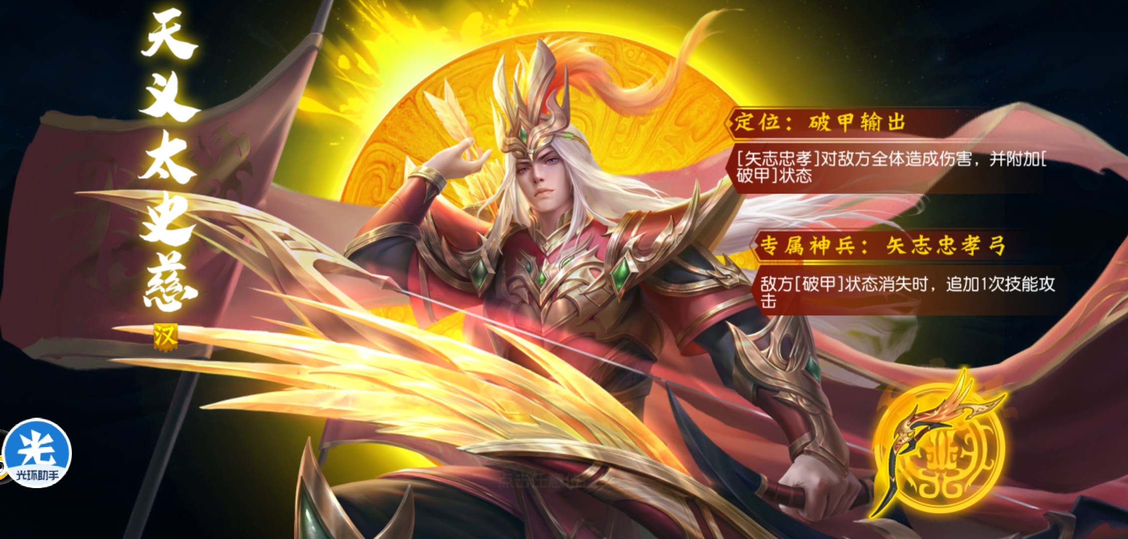 天义太史慈的破甲属性,对薄弱御甲的打击很给力,但面对超高御甲流,太史慈则撼动不了,所以天义太史慈在面对战力相近的阵容,会更好发挥追击的优势。