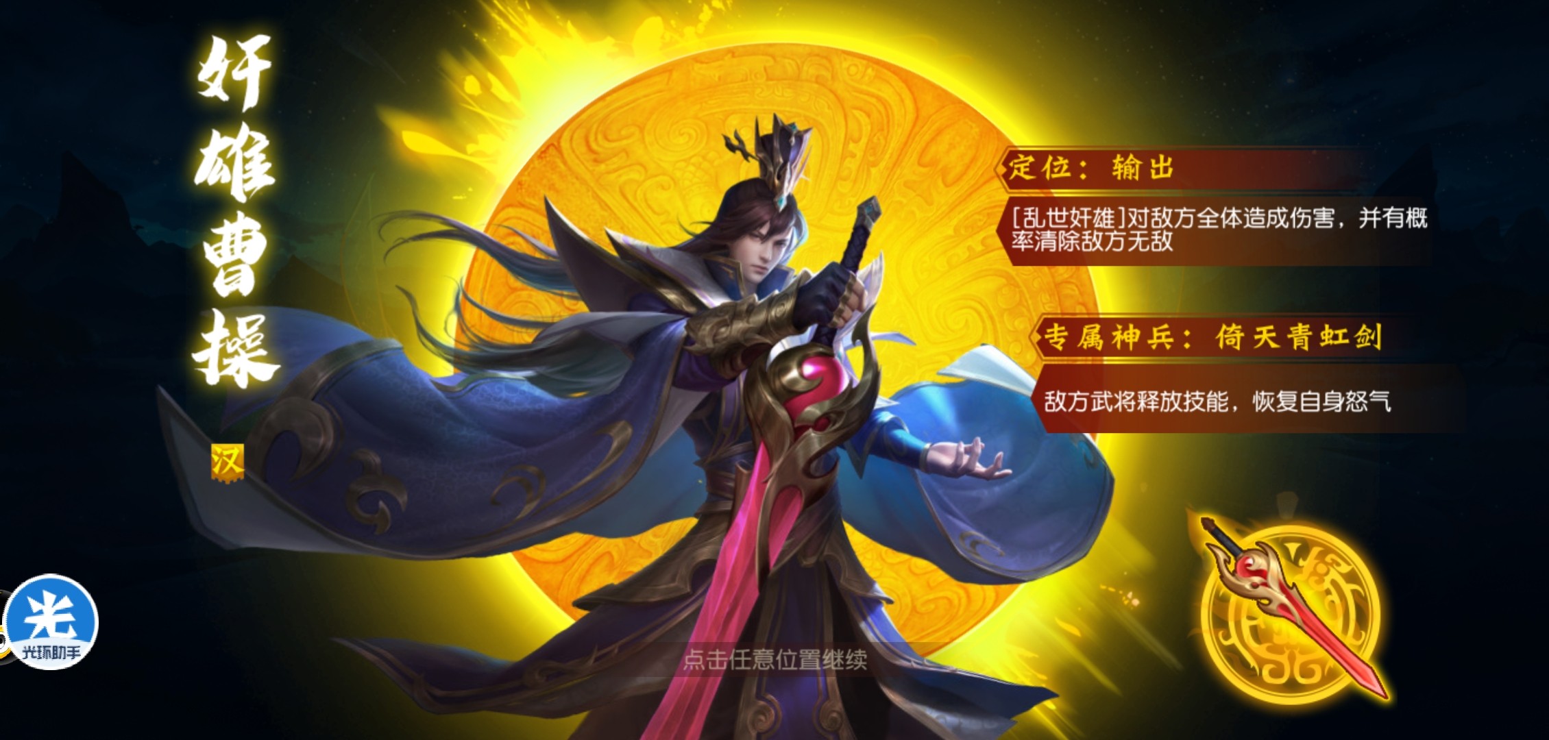 如果是奸雄曹操补下小刀,输出能力也较为一般,全员攻击,有16%几率清除无敌盾(增加曹操锦囊破无敌的几率)。