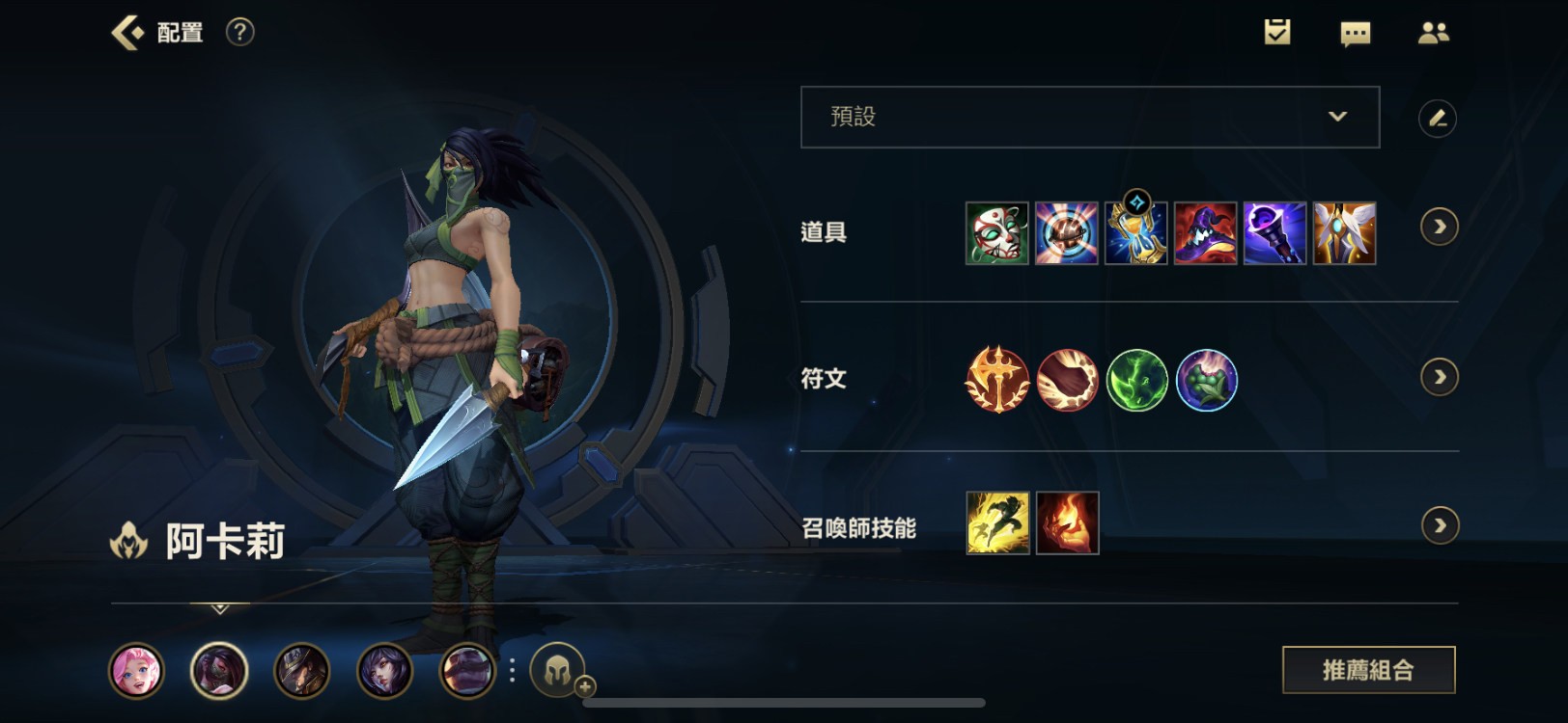 出裝第一件小面具,五秒後達到10%額外傷害,跟阿卡莉的相性極合,我通常其他裝出完才合到大面具。很順風的話第二件直上死帽+虛空杖也可以,後面看敵方陣容回血多的話復活甲可以改成黑魔禁書。