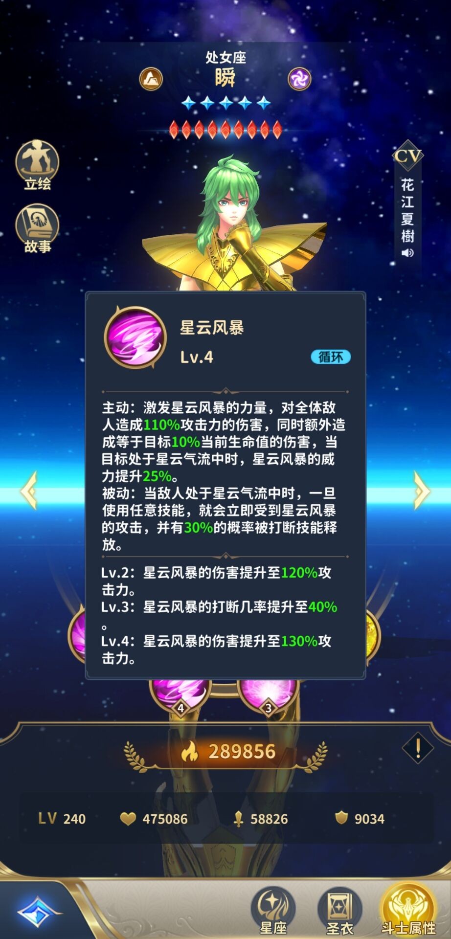 20级:奥义的星云气流下,谁攻击处女座瞬,就会被循环技能〔星云风暴〕百分百攻击,每秒触发一次