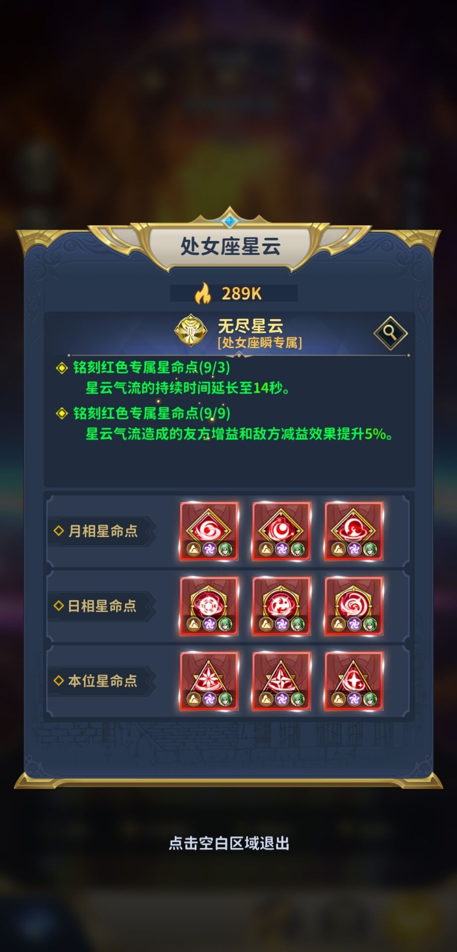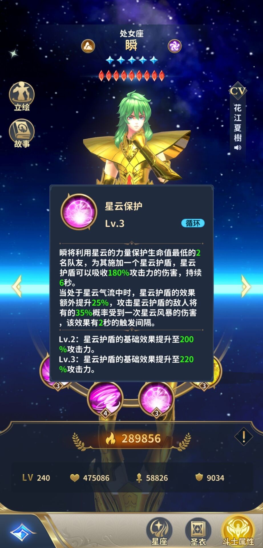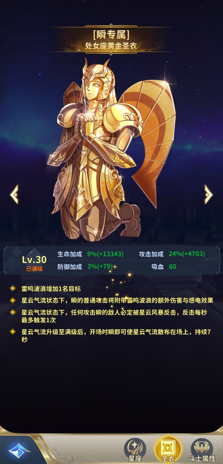 总结:黄金处女座瞬的定位是技斗士,也就是半辅助半输出。除了能给队友加攻击和攻速外,还能给敌人降防御和命中,并且有几率施加“感电”和“僵直”效果。当然处女座瞬也是一样比较吃圣衣,如果没满级圣衣的话,只能配个巨犬座,提前释放奥义,几率打断敌方技能