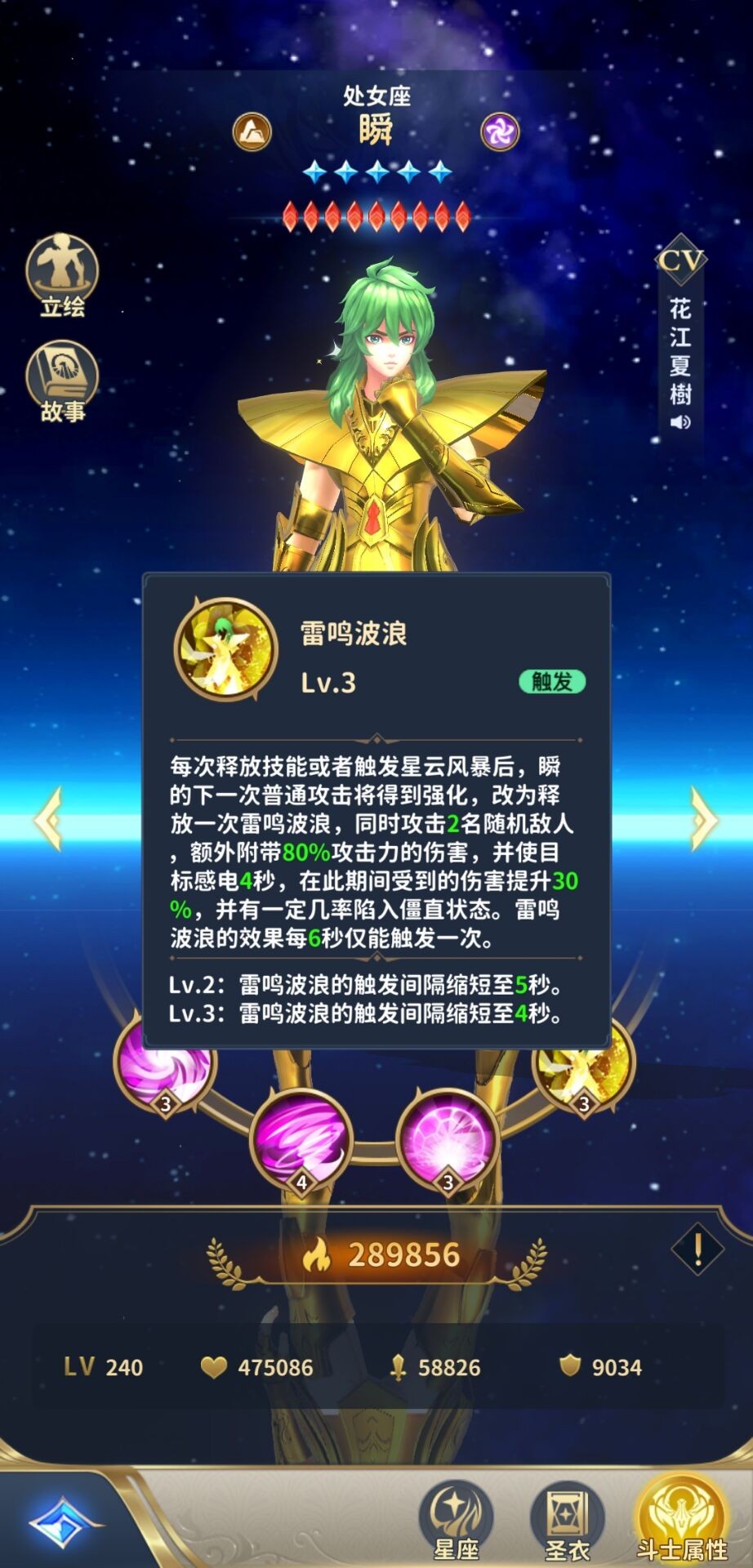 10级:奥义的星云气流下,处女座瞬的普攻附带雷鸣波涛的额外伤害和感电效果