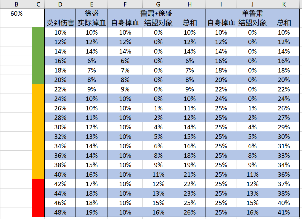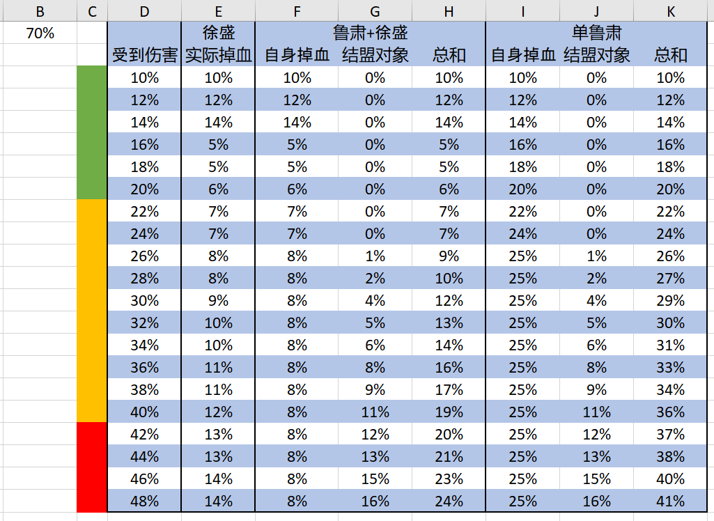 但是无论是以上哪个分区 对比60%和70%的两张图 单挂徐盛的情况下 武将实际受到的伤害 几乎没有大幅度的偏差(差个1% 2% 3%的样子)