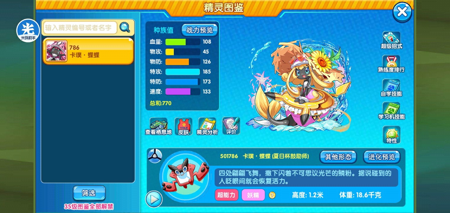 6)技能:回复技能:自我复原(变化)、吸取之吻(攻击)、魔法转换(攻击)等。强化属性:冥想、瞬间失忆、铁壁等。攻击技能:月亮之力、幻象术、魔法转换等。辅助技能:芳香、抛媚眼、甲壳、扫除等。具体看蝶蝶