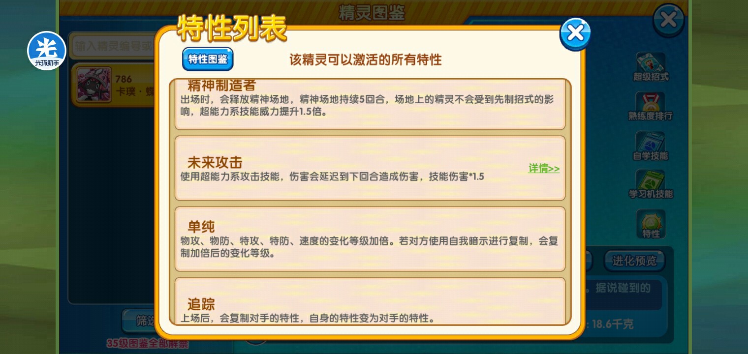 5)特性:推荐俩个【精神制造者】与【单纯】,开【精神种族值】精神场地可以有效反制恶作剧之心(在特性图鉴看看哪只精灵会这个特性),自身超能力属性威力提升1.5倍可以搭配自身技能超能力量;【单纯】1):搭配冥想、诡计、剑舞这种进行快速强化进攻。2)带瞬间失忆、铁壁、障碍强化防御属性。单纯会被自我暗示复制属性,单依我个人来看带这个技能的少之又少。