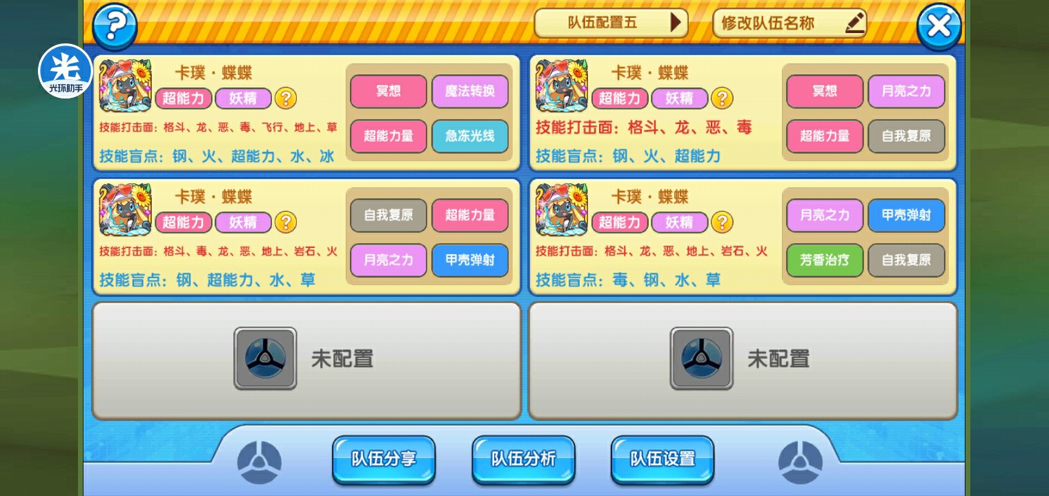 讲解:各位在这段时间都应该看过萌姐的视频吧,上了蝶蝶反制索罗亚(恶作剧之心)。技能中必带一个超能力属性技能,家里有条件可以带超能力量(对方多一个变化类技能伤害增加)其次就是幻象术;自我复原续航;月亮之力可以打打恶属性补超能力系盲点;甲壳弹射返场技能有条件抛媚眼(为什么抛媚眼自己懂的)