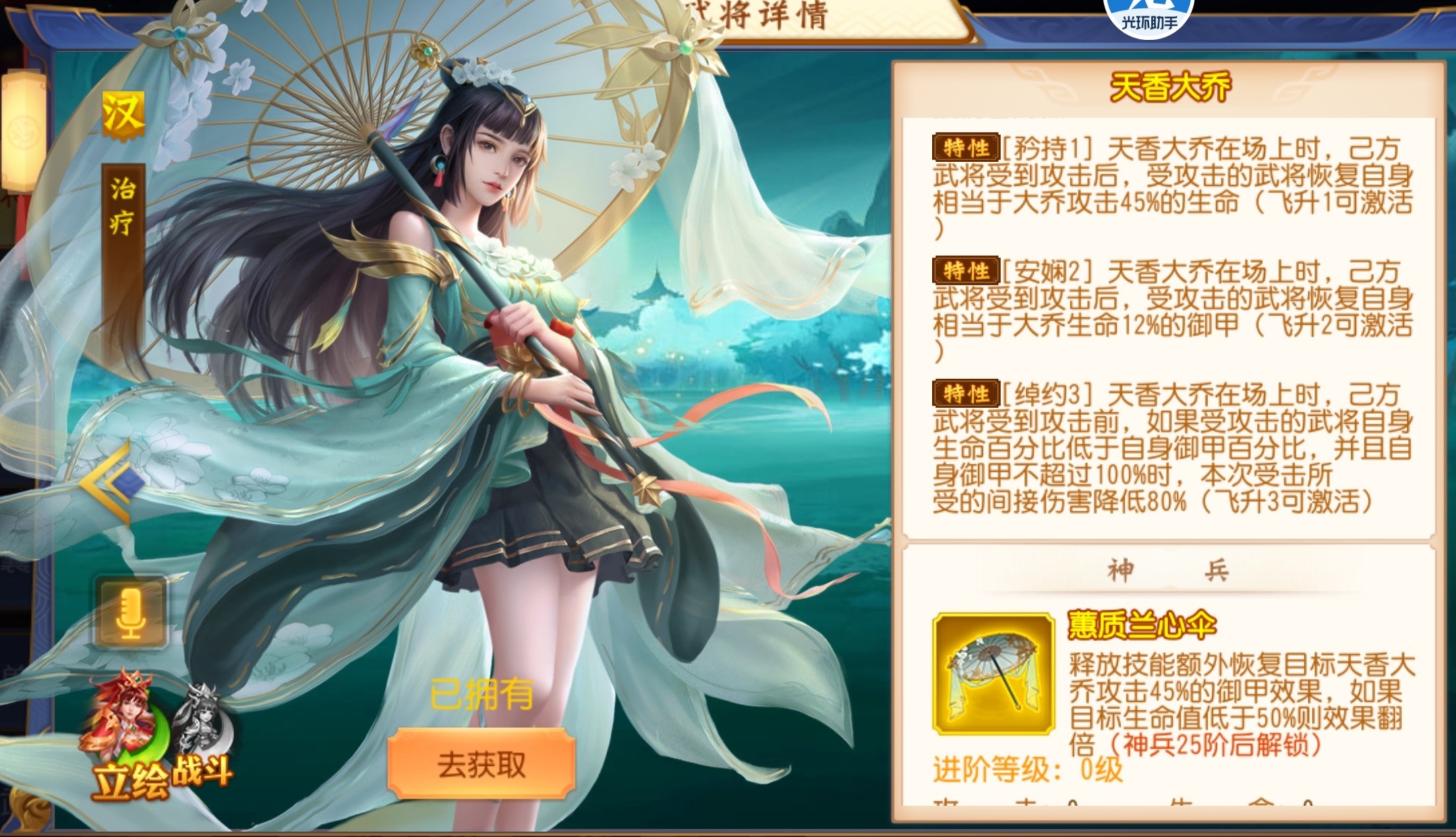 蜀:己方其他武将死亡时,天香大乔追加1次技能,此技能不消耗怒气(此技能不触发神兵效果) ;
