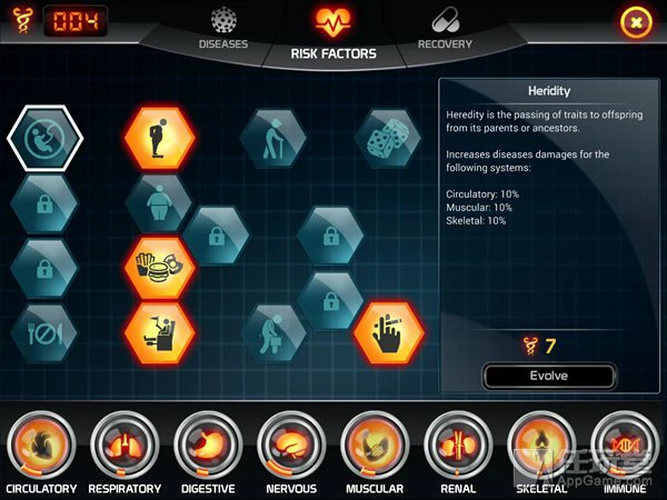 游戏中的病毒可以通过入侵人体的:“循环系统,呼吸系统,神经系统,肌肉系统,肾脏系统,骨骼系统,消化系统”还有改变人体基因这八大系统,来降低免疫力突破人体防御,从而破坏各个系统的功能造成人物死亡,虽然说这一点玩儿法和瘟疫公司的病毒传播大同小异,但是比起将病毒扩散到全世界,还是慢慢用病毒感染一个人的过程比较有快感!