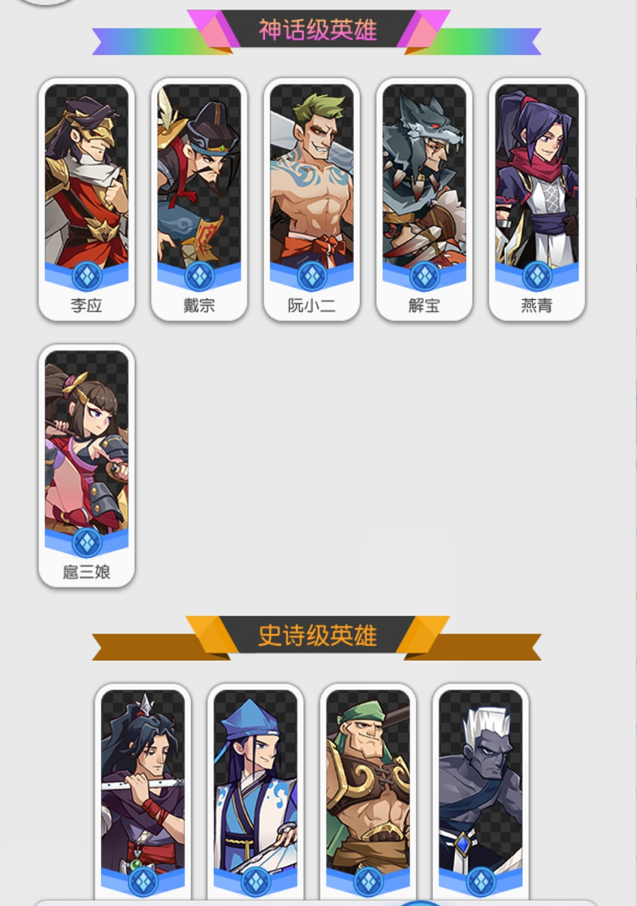 如图主要分为神话级和史诗级两大种类,其中史诗级可以忽略了没有培养的意义,完全当饲料卡处理,主要把资源集中在神话级英雄。二、史诗级英雄的特点