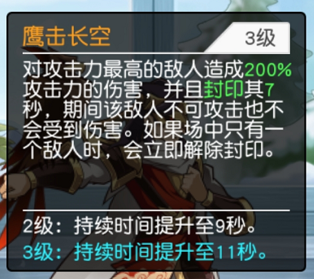 a. 可以把敌人封印7-11秒(战场效果是飞离场内)这就相当于这么久时间敌人一直是4打5的状态,狠不?